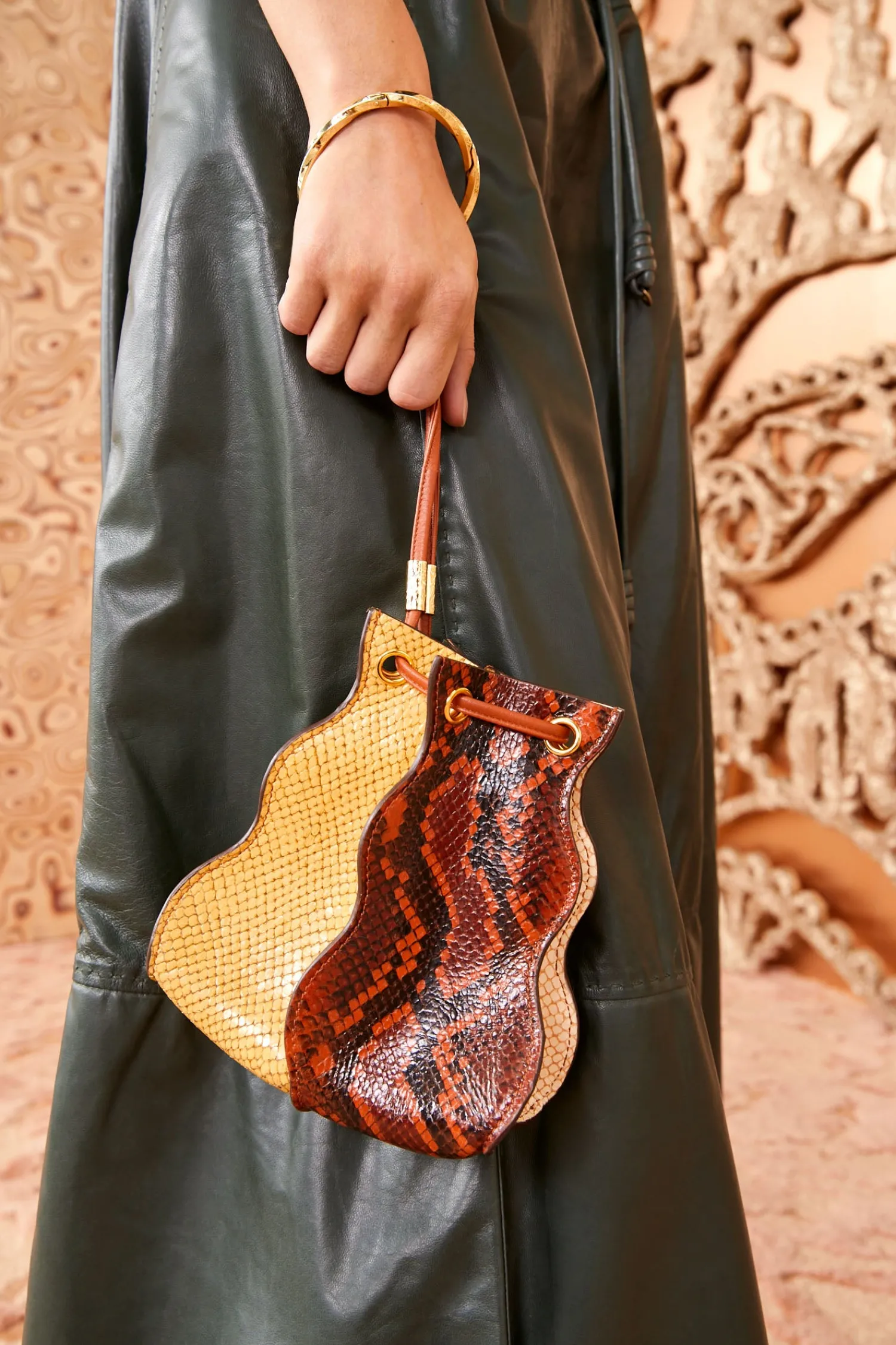 Featured throughout our Autumn/Winter ‘24 runway, our beloved Adria silhouette is updated for the season in a sleek and compact pochette. This small but mighty bag is carved from varying strips of python-embossed leather that mimic the beauty of undulating waves. It is topped with an elegant bracelet-inspired ring that’s detachable and has a removable crossbody strap.
