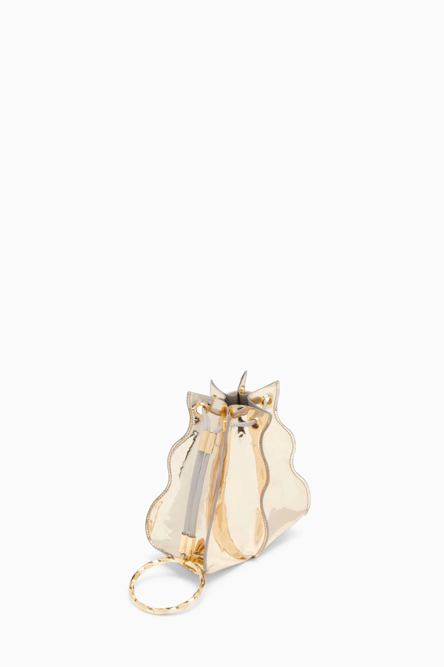 Featured throughout our Autumn/Winter ‘24 runway, our beloved Adria silhouette is updated for the season in a sleek and compact pochette. This small but mighty bag is carved from strips of light metallic gold leather that mimic the beauty of undulating waves and is finished with a Dove gray trim. It is topped with an elegant bracelet-inspired ring that’s detachable and has a removable crossbody strap.