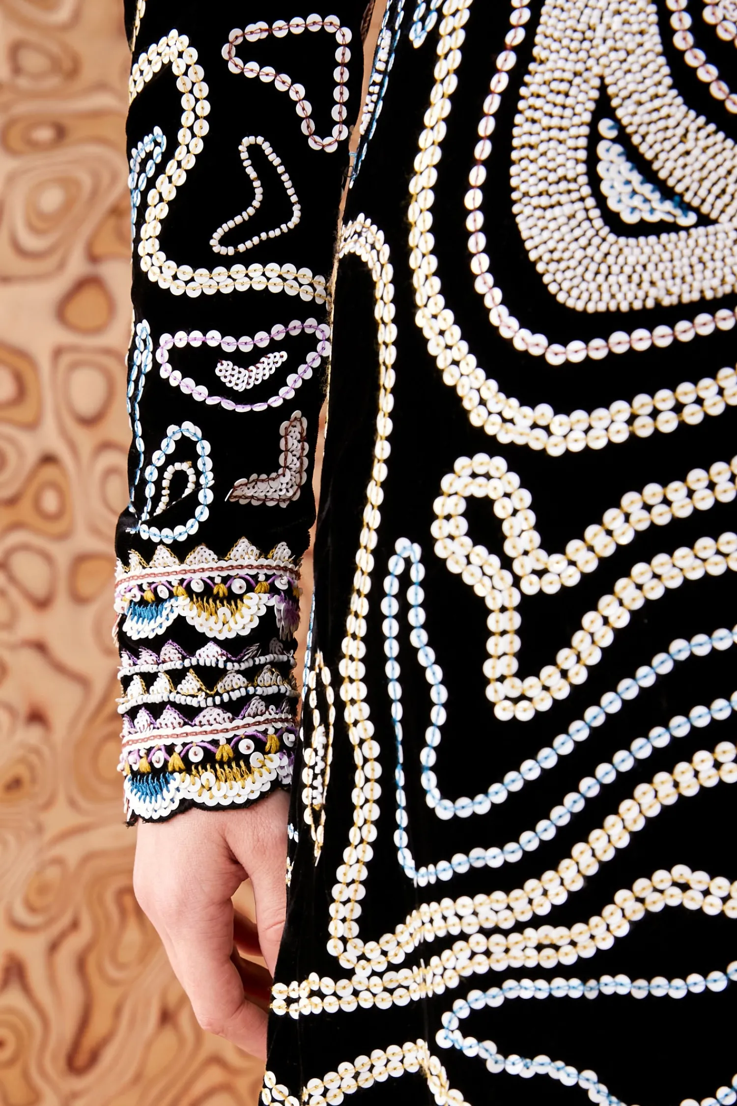 A standout silhouette from Look 19 of our Autumn/Winter ‘24 runway, the Alexia Dress is a future heirloom made from silk-blend velvet that’s hand-embroidered in India with sequins, beads, and threads, creating floral and animalesque motifs. This black, long-sleeve style boasts a column silhouette and is framed by our signature puff shoulders, beautifully unfurling to an ankle-grazing hemline. It fastens a concealed back zipper.