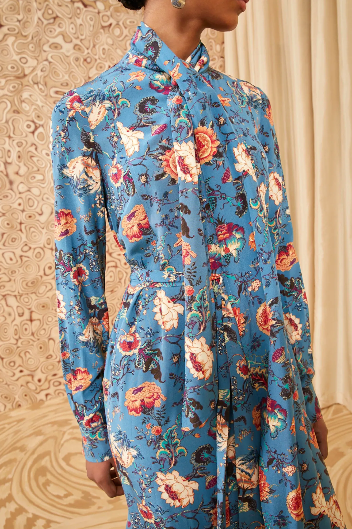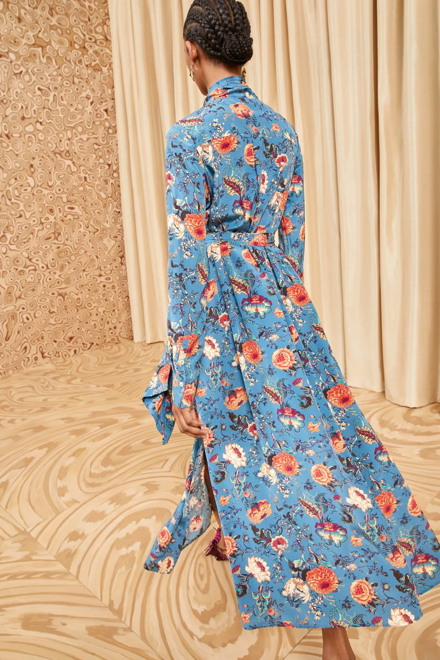 Featured in Look 33 of our Pre-Fall 2024 Lookbook, the Anisa Dress is a stunning new frock crafted from our forever favorite silk crepe de chine. Red and cream florals pop against the rich blue background of this vintage-inspired botanical print. This flowing maxi-length silhouette features billowing sleeves, a front button-down closure, a self-tie at the waist, and a necktie that beautifully cascades down the front.