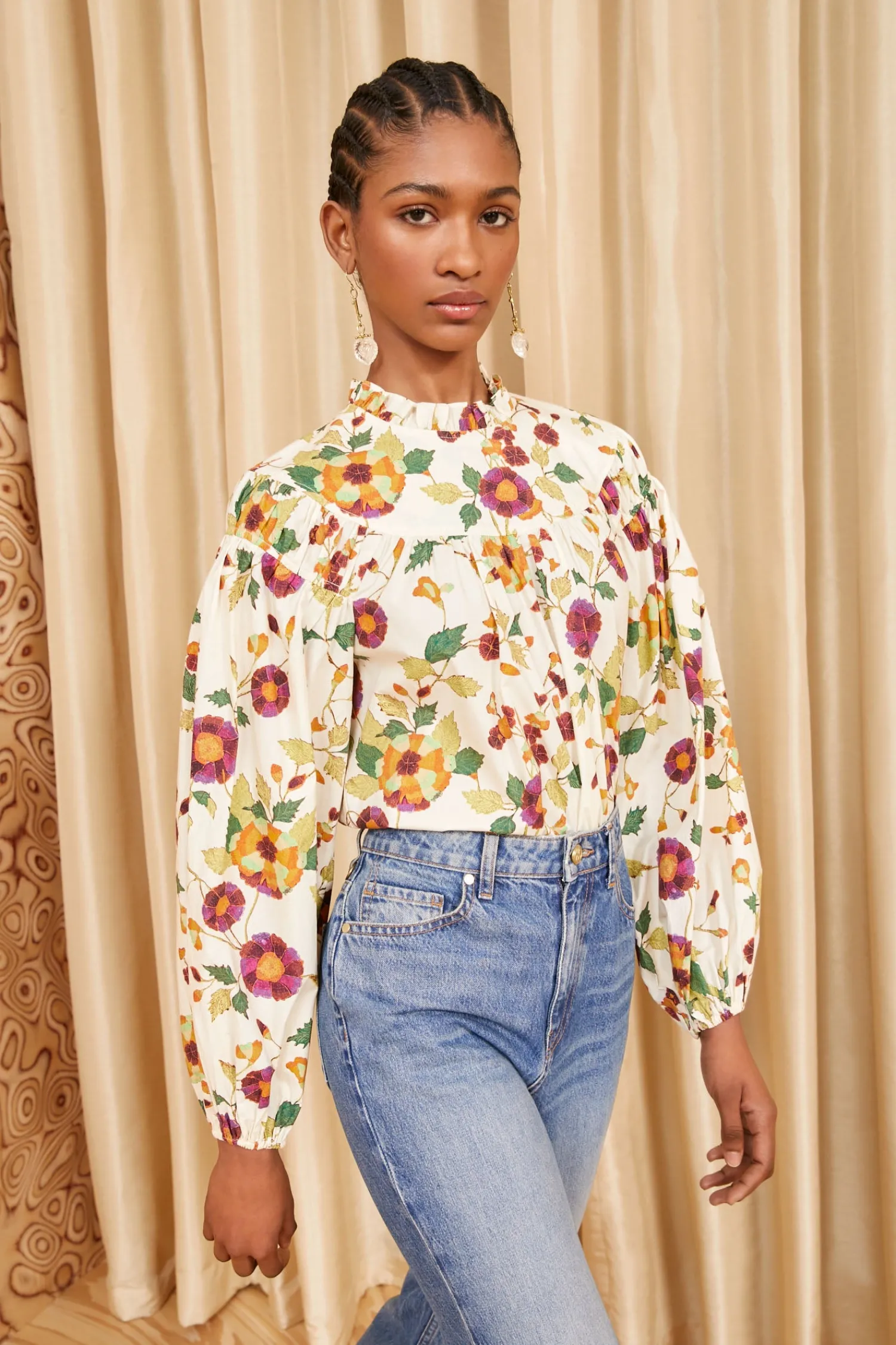 Our Ardith Blouse is alive with romantic tumbling florals inspired by a vintage batik print. A bestselling silhouette, this cream, pink, and orange style features long voluminous sleeves, elegant gathers at the yoke, and is traced with delicate ruffles at the high neckline. It has elastic cuffs and fastens with a buttoned keyhole at the back.