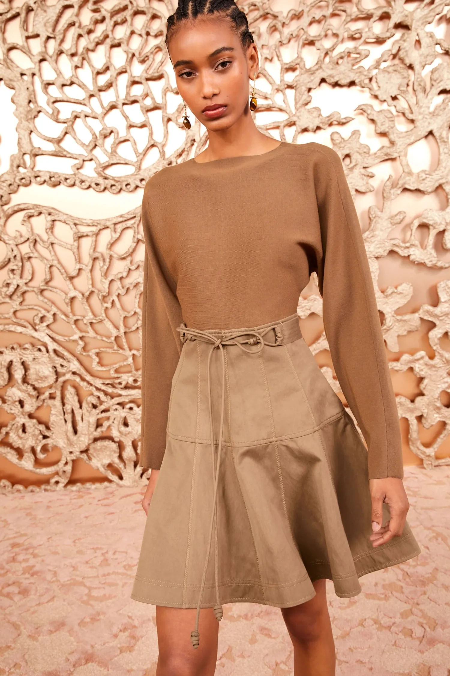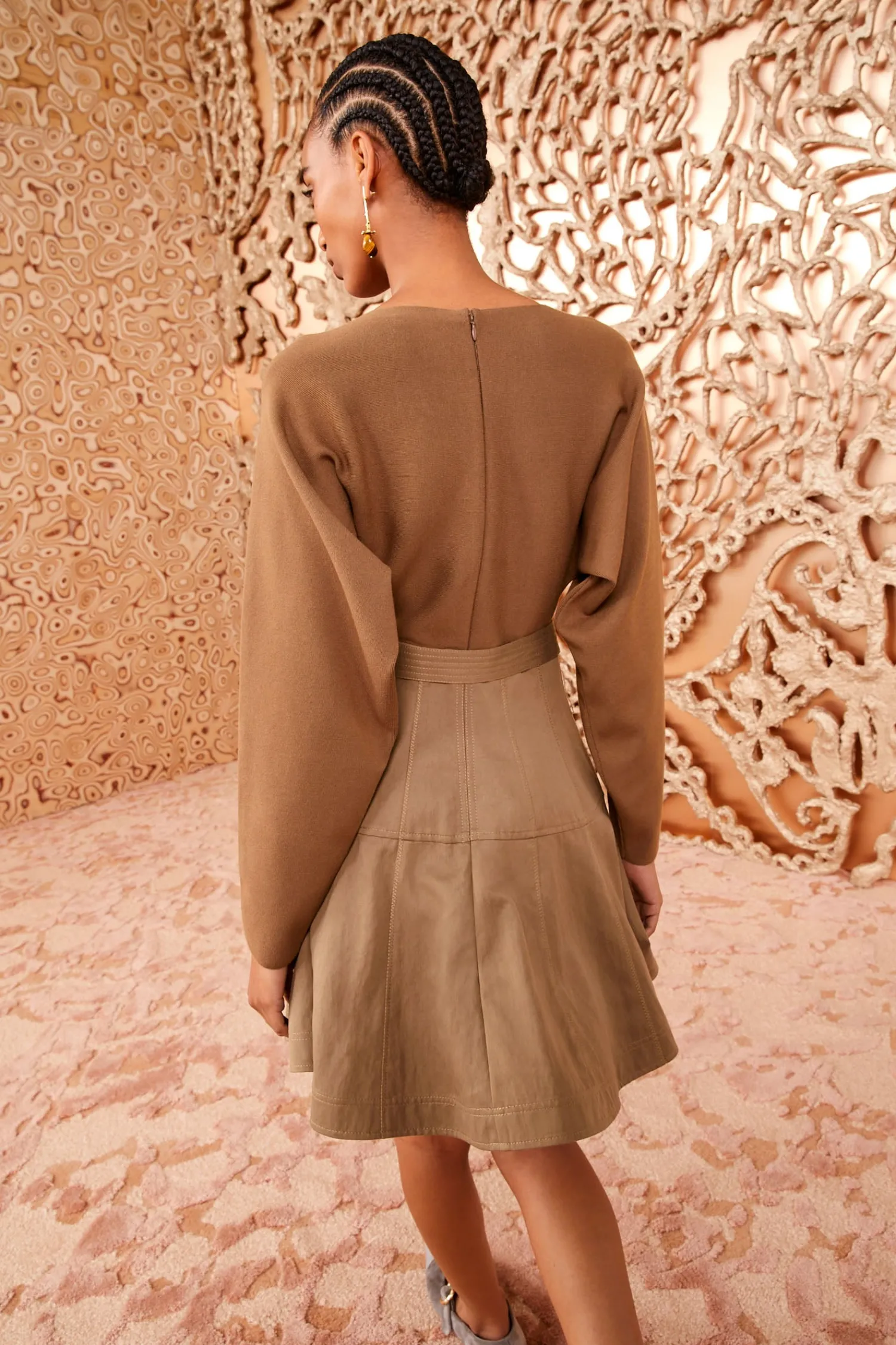 Our Aremi Dress is a sculptural silhouette with a smooth, knit-like bodice juxtaposed with a twill suiting skirt. This soft brown mini dress has beautiful volume in the long sleeves and falls to a playfully flared A-line skirt with tonal seam detailing. It has a removable belt that cinches the silhouette.