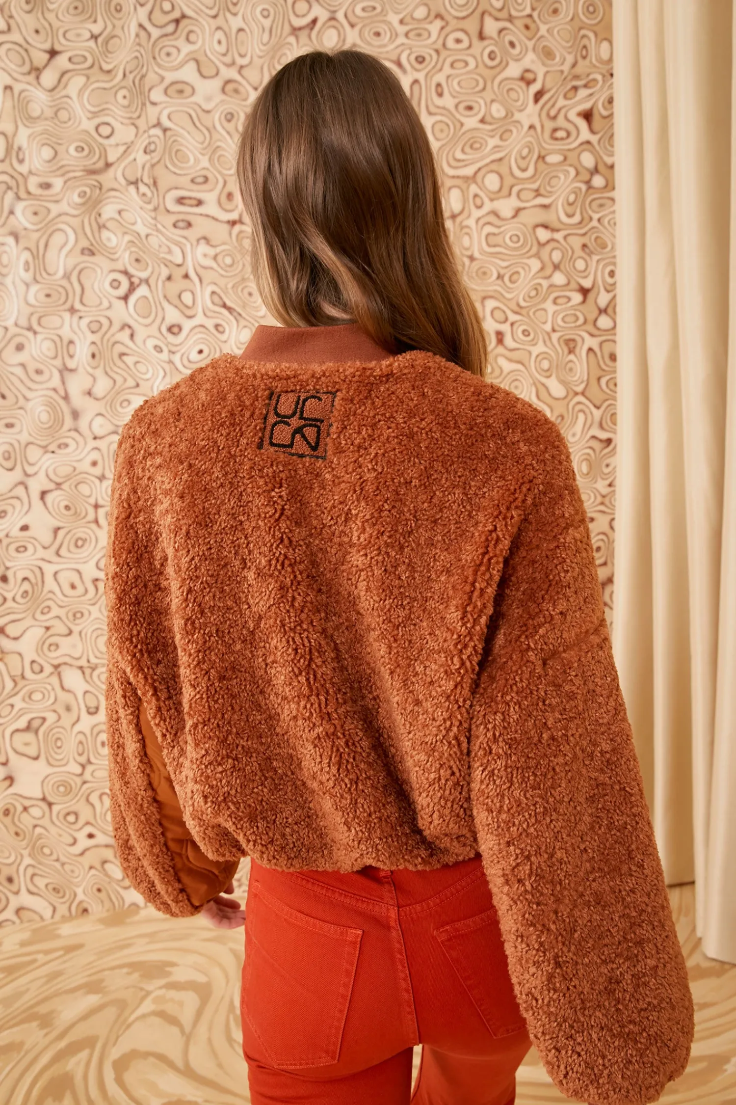 Cropped and cozy, our Arlyn Jacket arrives in a sportif combo of plush teddy fleece and quilted sateen in rich tierra brown. This utilitarian-inspired bomber jacket has patch and front slit pockets and voluminous long sleeves with ribbed cuffs. It is adorned with our signature monogram at the back and fastens with a zipper at the front.