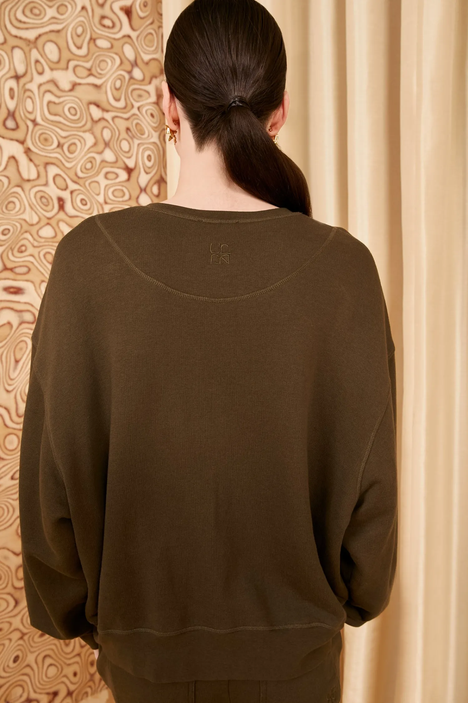 Made from bamboo and organic cotton fleece, our Asa Pullover reflects our ongoing efforts to lower our impact on the planet. This plush, long-sleeve style features a classic crewneck with a concealed buttoned placket, is the deepest militaire green, and is subtly adorned with our signature monogram at the back.