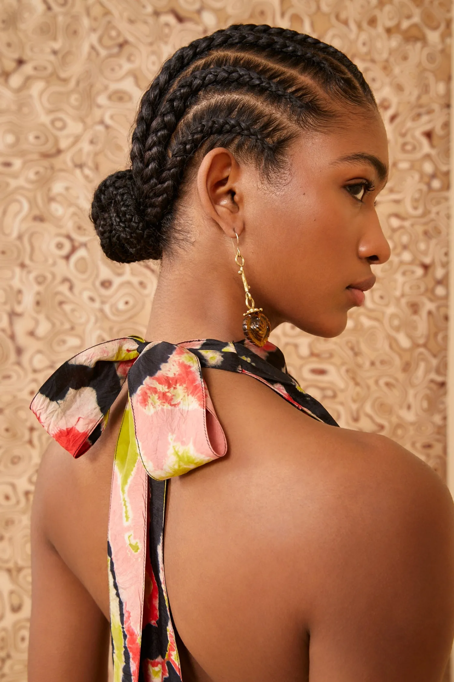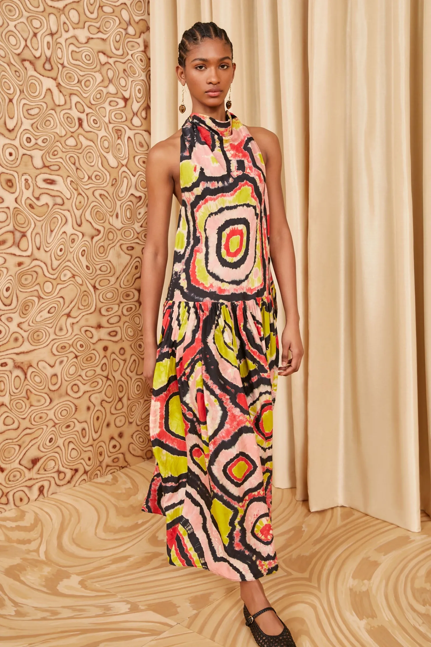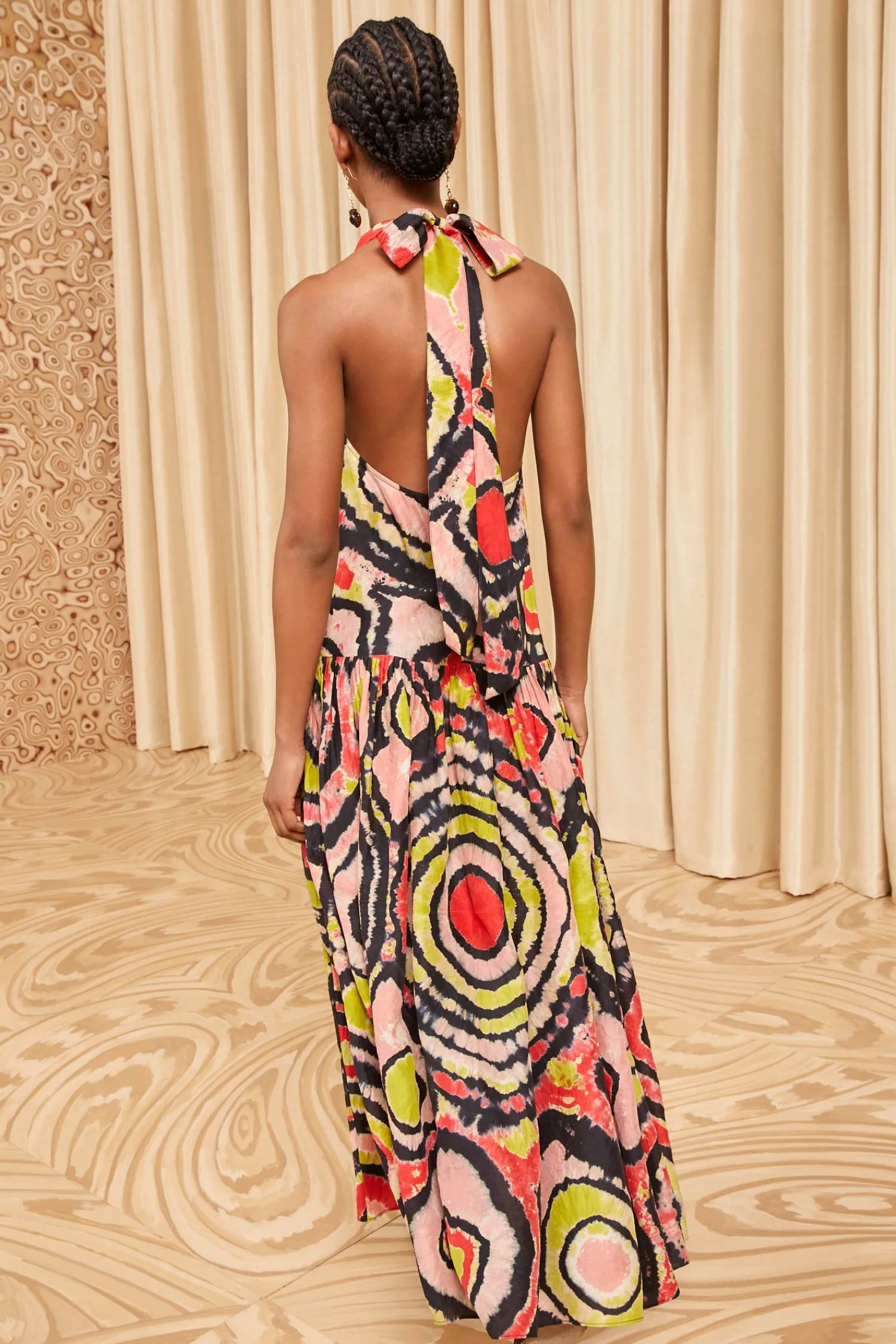 Featured in Look 11 of our Pre-Fall 2024 Lookbook, the Assa Dress displays the impeccable artistry of our female artisan partners in Bangalore—a women’s cooperative located on a rehabilitated coconut nursery that’s dedicated to consciously crafted textiles. Lightweight silk habotai is carefully hand-tied and dyed, creating a one-of-a-kind motif in vibrant red, green, and black. This midi silhouette features a cowl neckline and a softly gathered skirt. It fastens with ties and a button closure at the halter neck.