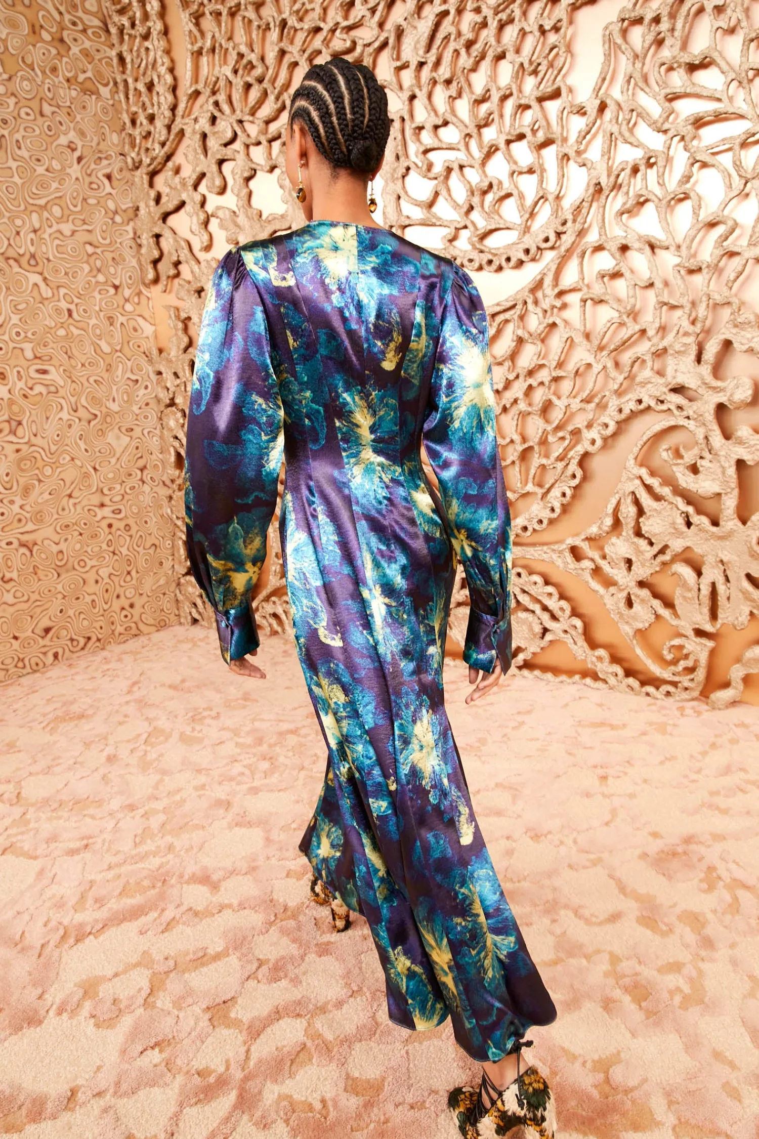 The Azrou Dress comes impeccably structured from our high-shine satin that’s deeply saturated with green and blue botanicals against a blue backdrop. This sleek lovely has a V-neckline, long sleeves, and a streamlined silhouette that unfurls to an elegant midi length. It fastens with a concealed back zipper.