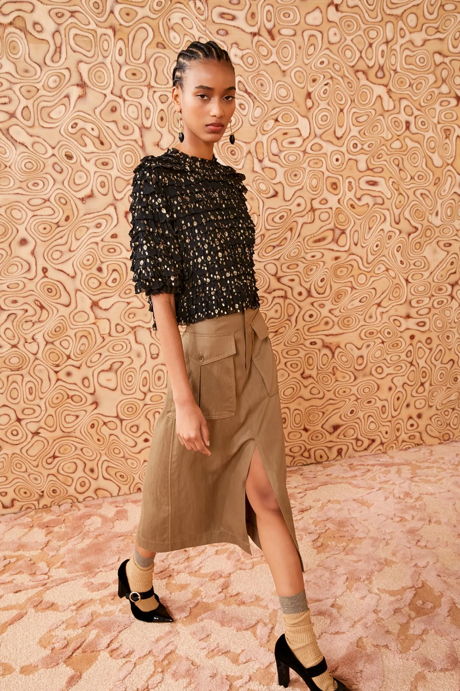 Visually stunning, our Carmella Blouse is made from crinkle chiffon that flickers with lurex dots woven into the fabric, bringing a shimmering touch to the classic black background. This short-sleeve style has a round neckline and a relaxed fit that’s exquisitely tiered and ruffled throughout. It fastens with a center-back zipper.