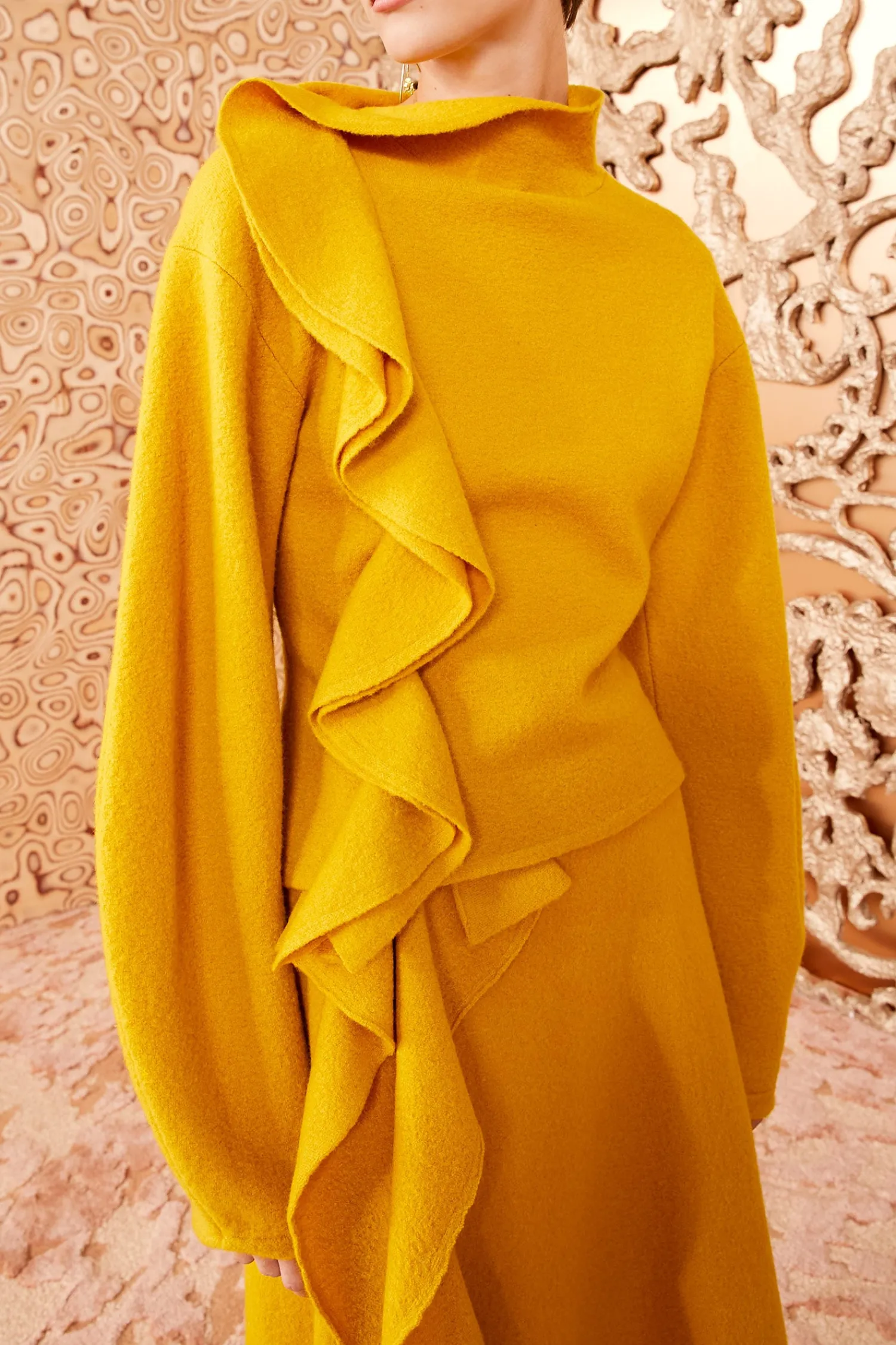 As seen on Ulla for the Autumn/Winter ‘24 runway finale, the Corinna Pullover is a sculptural silhouette made from felted merino wool in a rich golden turmeric hue. Impeccably soft and lightweight, this long-sleeve top beautifully cocoons the body and is adorned with cascading ruffles. Style yours with our Mireya Skirt for the complete runway look.