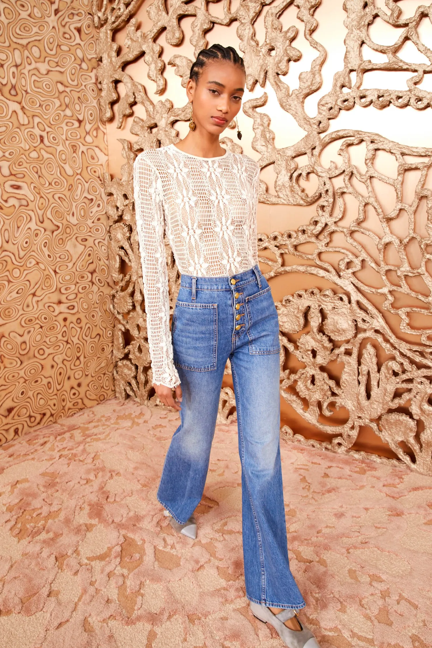 Our Cyrus Top is a richly textural lovely made from stretch Italian cotton lace with linear graphic florals. Ideal for layering or wearing on its own, this pristine white long-sleeve style has a round neckline and a sleek, fitted silhouette. It is unlined and is fully sheer.