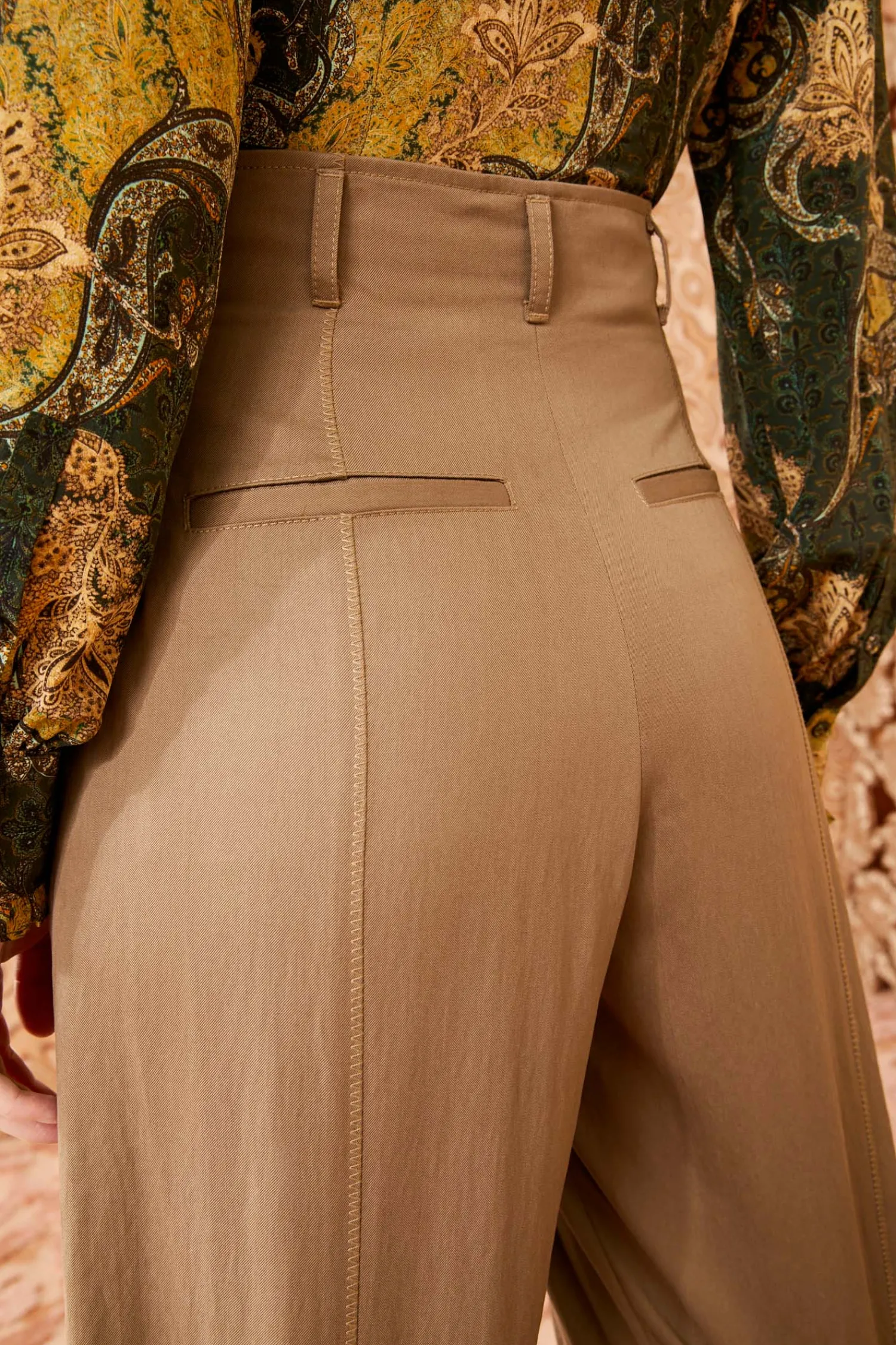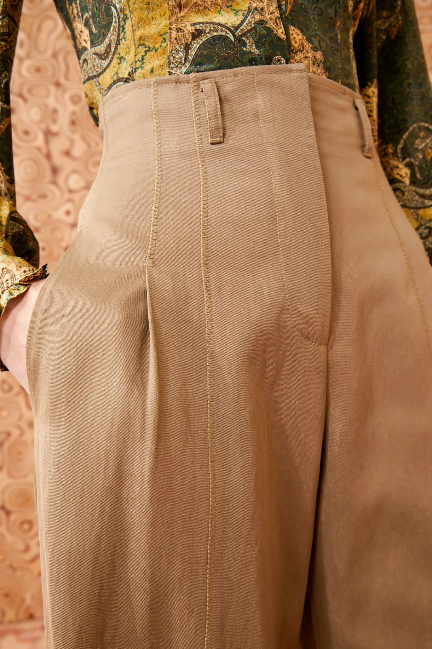 Designed with a flattering high waist, this utilitarian style has belt loops with subtle pleating at the front and elegantly pools to a wide leg. It fastens with a concealed front hook, button, and zipper.