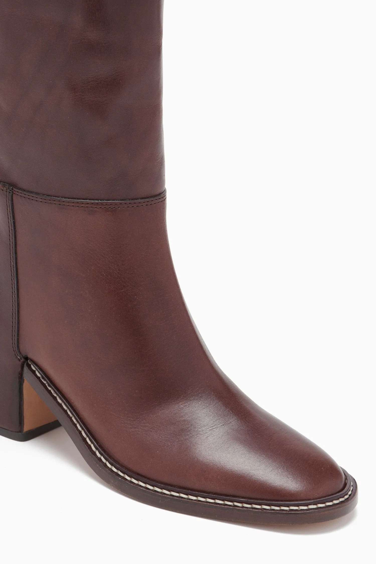 The Elena Riding Boot is crafted in Italy from luxurious calfskin leather in a rich chocolate brown. This knee-length style rests on a 65mm block heel, pulls on for effortless wear, and can be easily worn with a beloved dress, skirt, or our handmade denim.