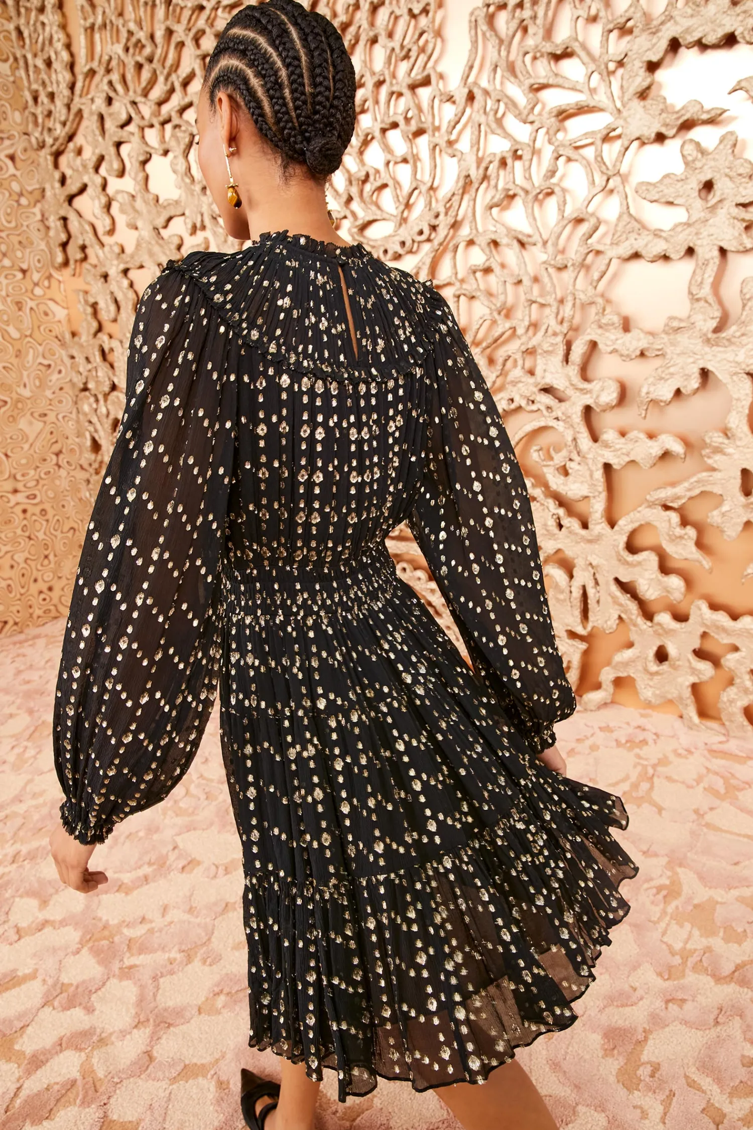 Our Elisa Dress flickers with lurex dots woven into crinkle chiffon, bringing shimmering beauty to the black backdrop. This dynamic frock has smocking at the neckline and elastic waist, airy sleeves, and floats to a mini hemline. This style is lined in the bodice and fastens with a back buttoned keyhole.