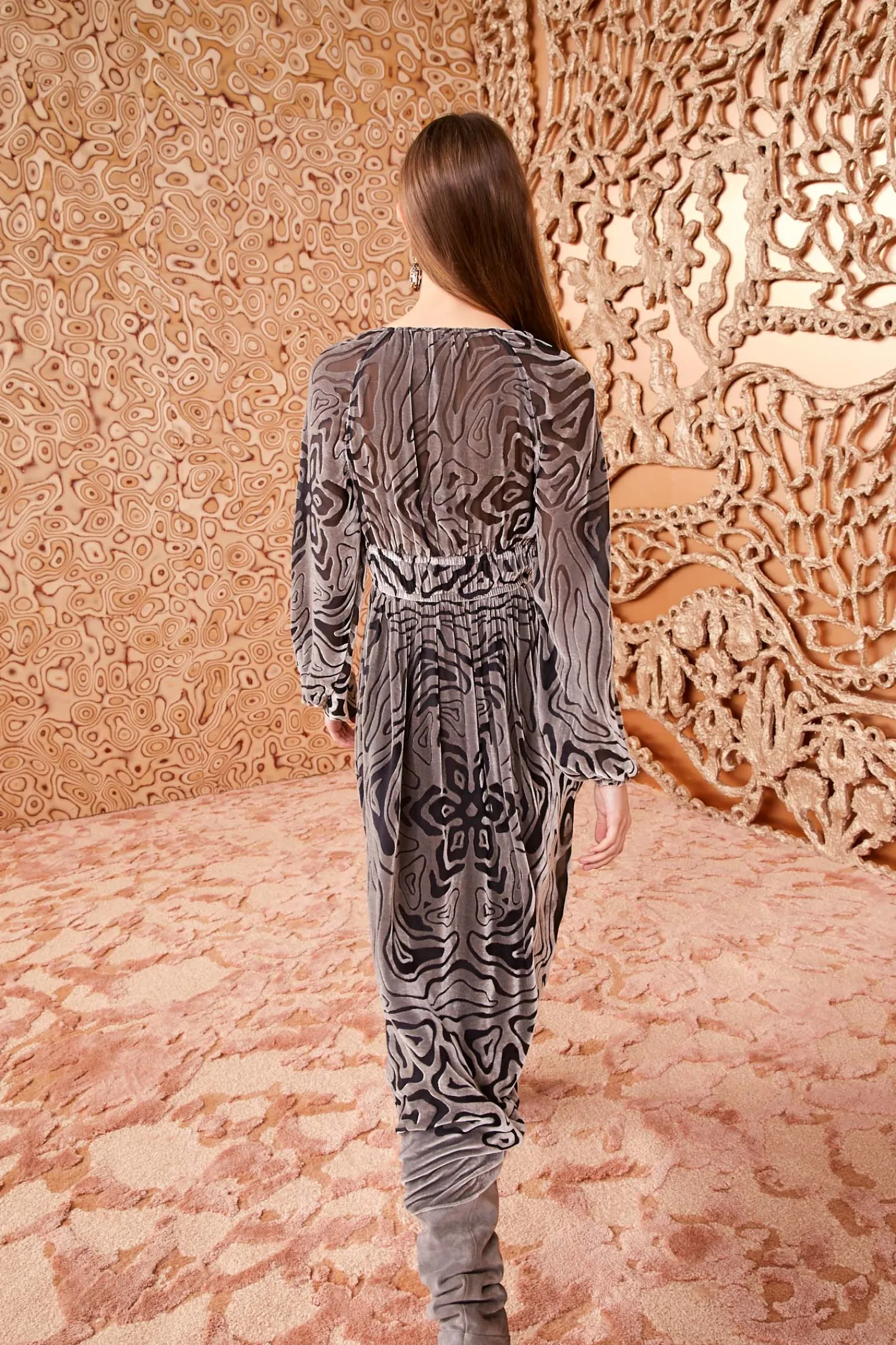 The Elora Dress is an intricately detailed lovely made from silver burnout velvet with a botanical motif at the center, surrounded by swirling animal-like patterns. This exquisite beauty has a V-neckline with voluminous long sleeves, an elastic waist for comfort, and unfurls to a midi-length hem. It pulls over and is lined in the bodice and skirt.