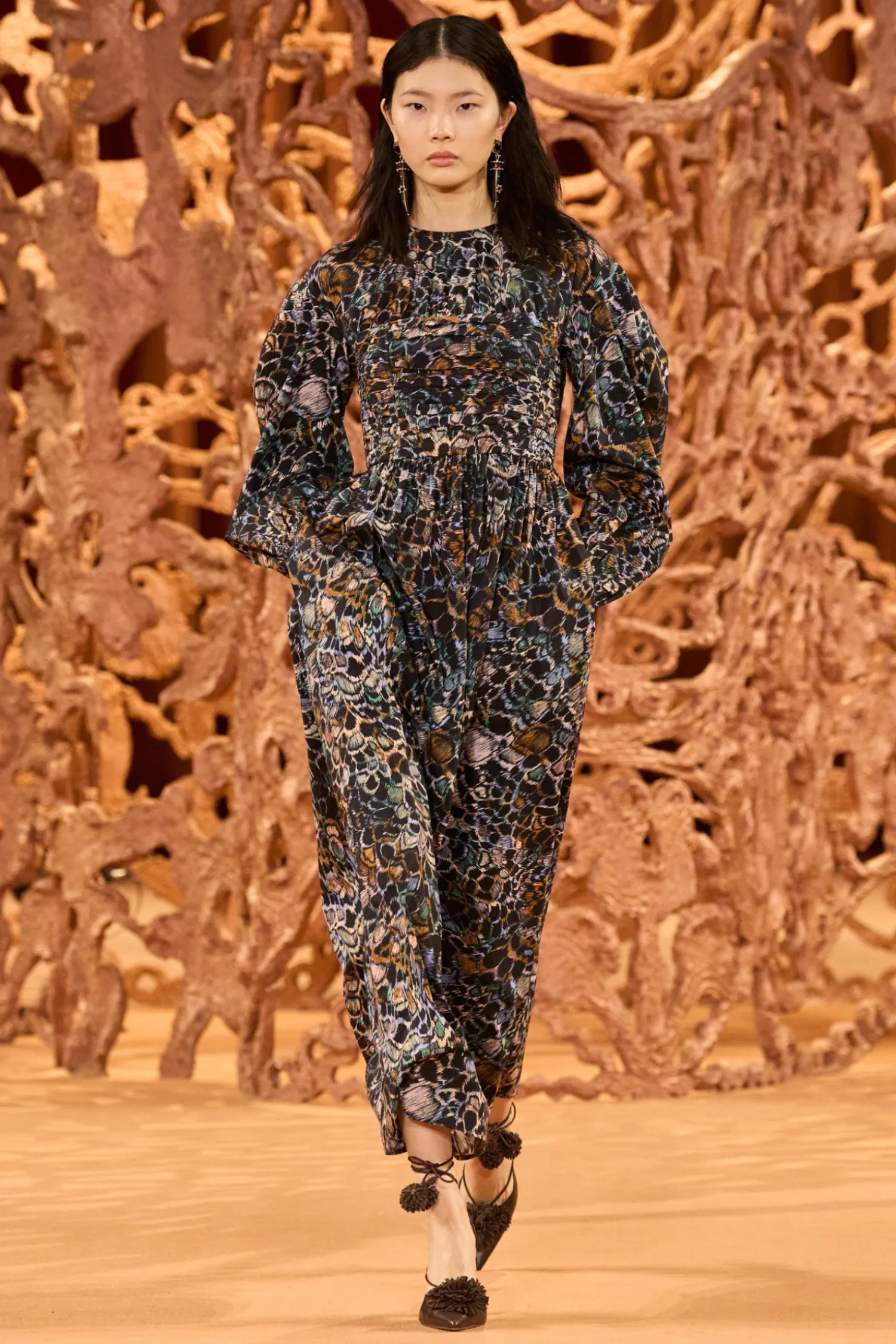 Debuting in Look 11 of our Autumn/Winter ‘24 runway show, the Estyne Dress is made from cotton poplin with a swirling feather print that adds edge to the feminine silhouette. Featuring notes of orange, blue, and black, this frock has gorgeous pleating at the bodice that accentuates the frame and is adorned with our signature billowing sleeves. It falls to an ankle-grazing hemline, has side pockets, and fastens with a center-back zipper.