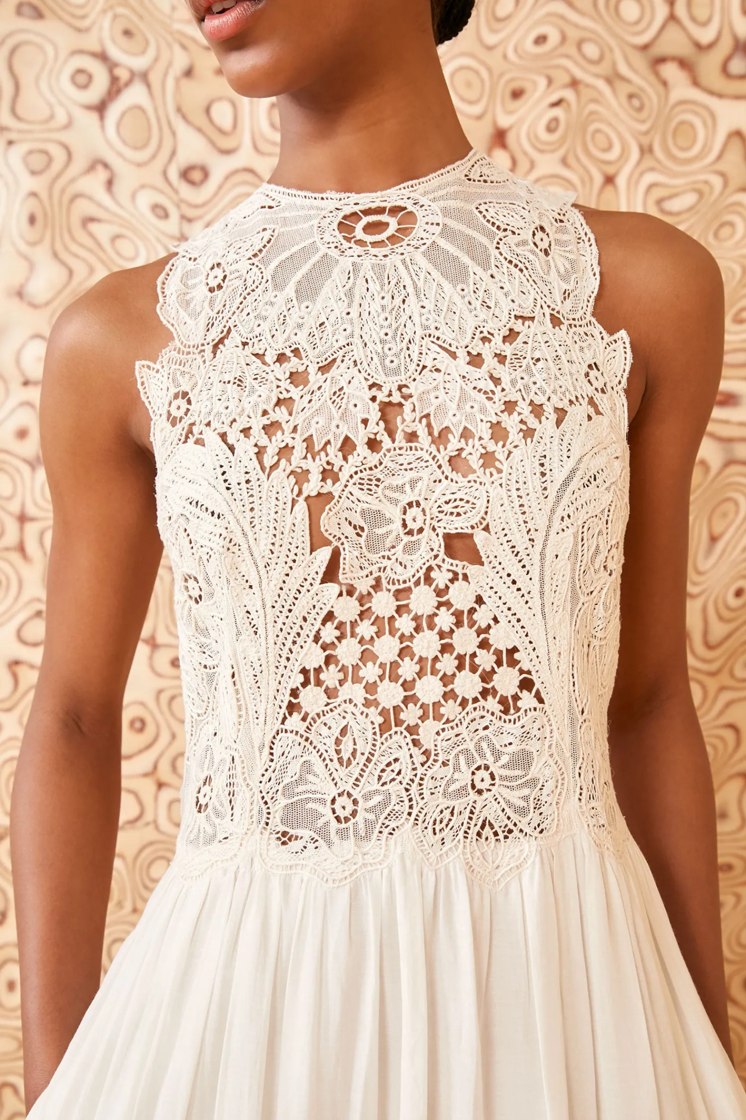 The Fleur Dress is a stunning frock engineered with beautiful garden floral lace at the bodice, and a flowy skirt made from soft cotton-silk voile. This ethereal white lovely is designed to be fitted at the top and has a gently flared hem that’s adorned with delicate pintucks. It has side pockets and fastens with a concealed back zipper.