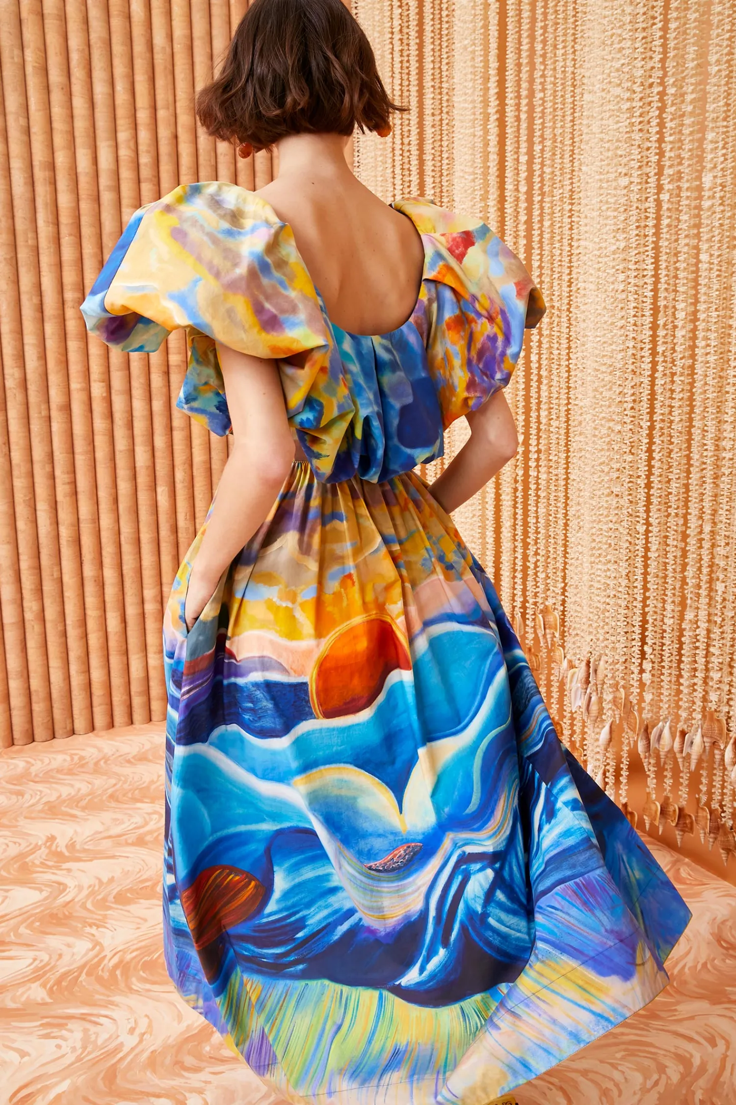 The opening Look from our Spring/Summer ‘24 Runway Show–and one of Ulla’s personal favorites for the season–our Francesca Dress is part of our exclusive collaboration with renowned painter Shara Hughes, whose dreamy 2021 sunset painting “Tuck” is translated across our signature cotton poplin with electric blue and yellow hues. A limited-edition piece, it features voluminous sleeves, a V-neckline, and unfurls to a gathered midi hemline. It has side pockets and fastens with a concealed side zipper.