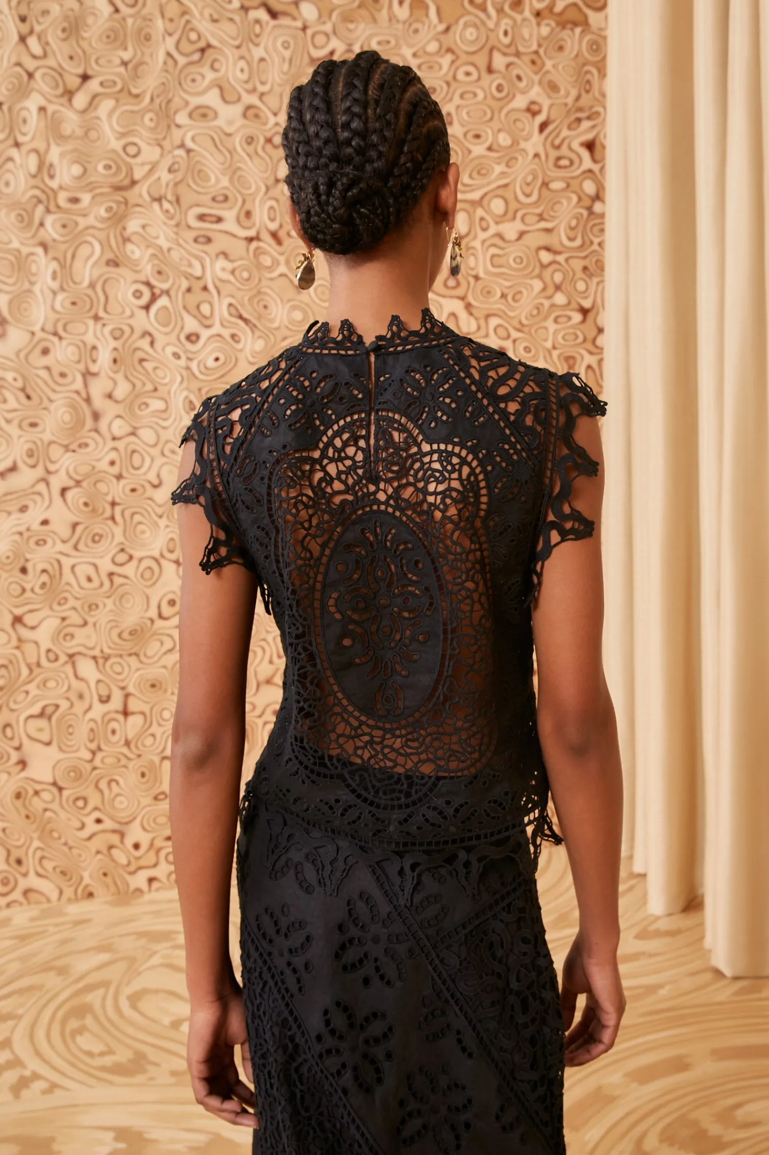 Our Gaia Top is made from the most intricate patchwork of floral eyelet linen and lace. Arriving in forever versatile and elegant black, this sleeveless lovely has a high neckline and is unlined to highlight the beauty of the pattern. It fastens with a buttoned keyhole at the back.