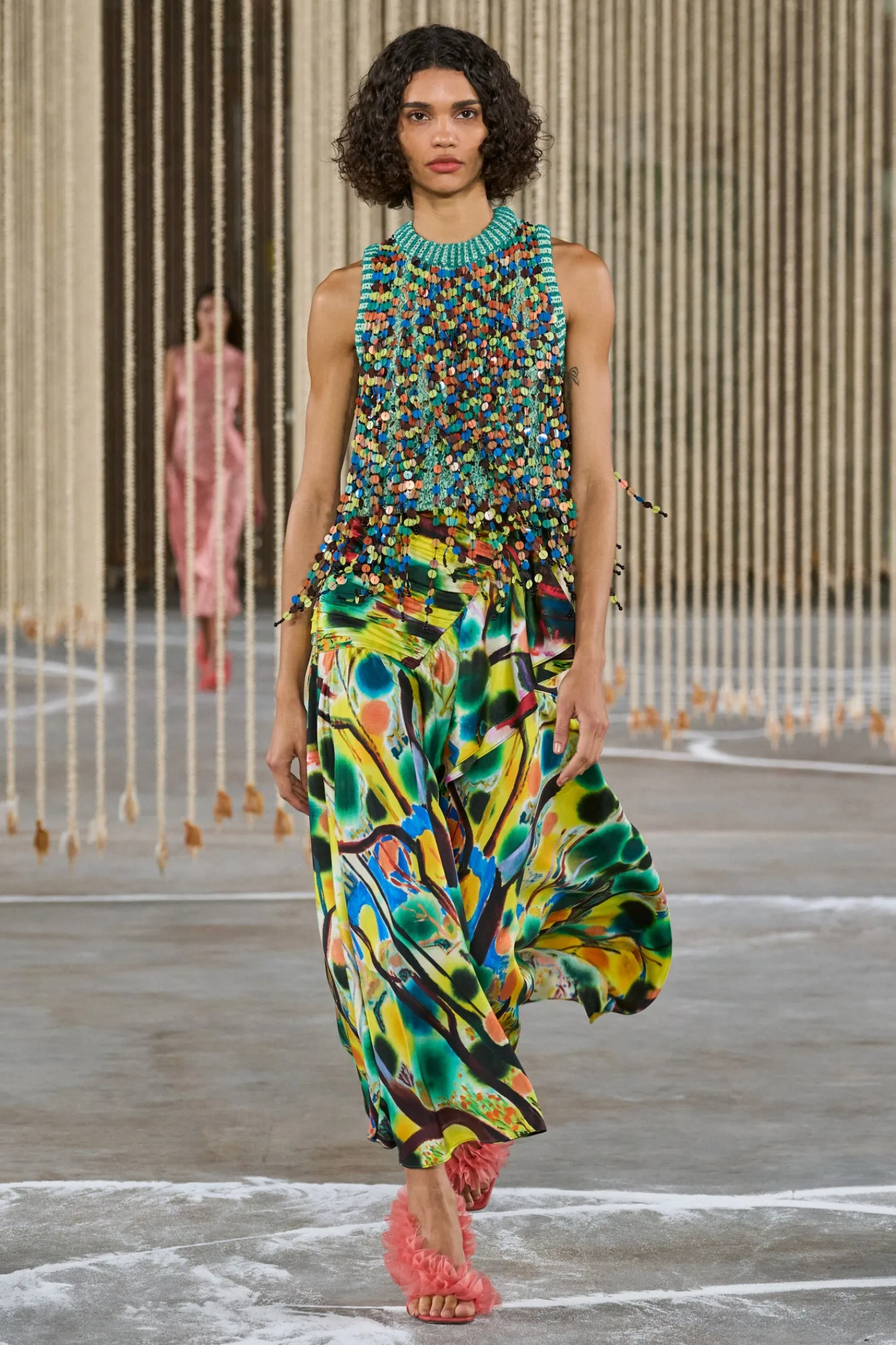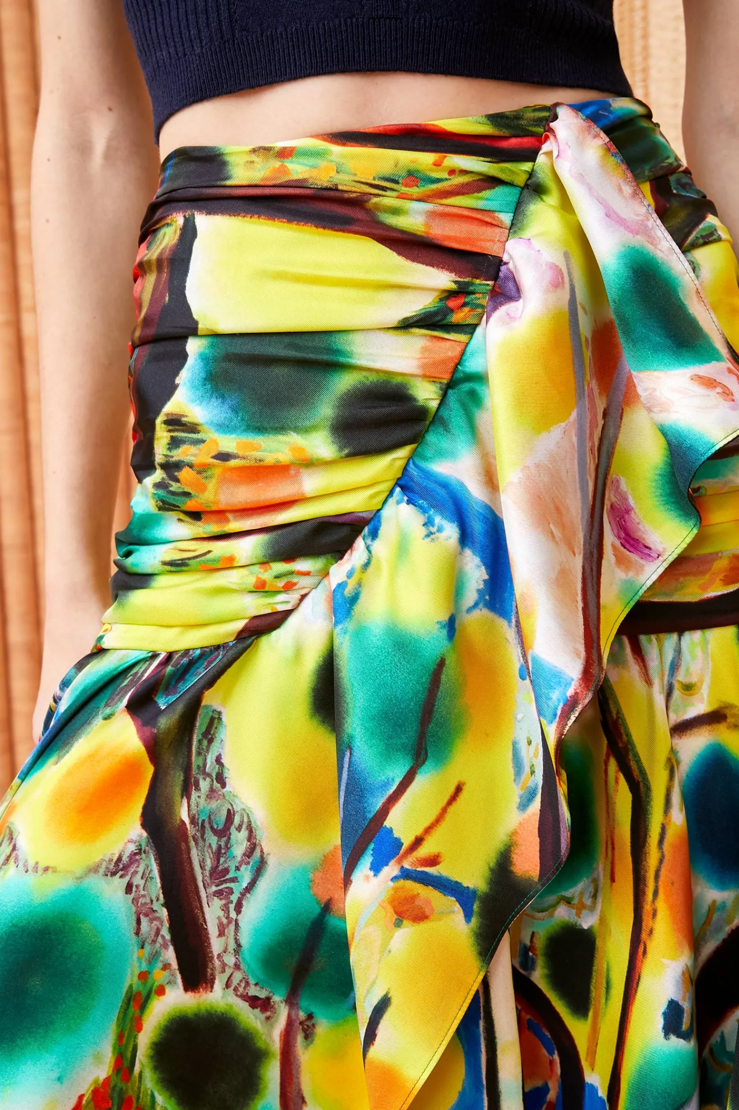 Featured in Look 52 of our Spring/Summer ’24 Runway Show, our silk-twill Georgina Skirt is a limited-edition piece from our collaboration with celebrated Brooklyn painter Shara Hughes, whose breathtaking 2018 painting “Ignoring the Present” is rendered across the silhouette. Featuring shades of yellow, green, and blue, this midi-length style is gathered at the waist and has ruffles that playfully cascade down the front. It fastens with a concealed side zipper.