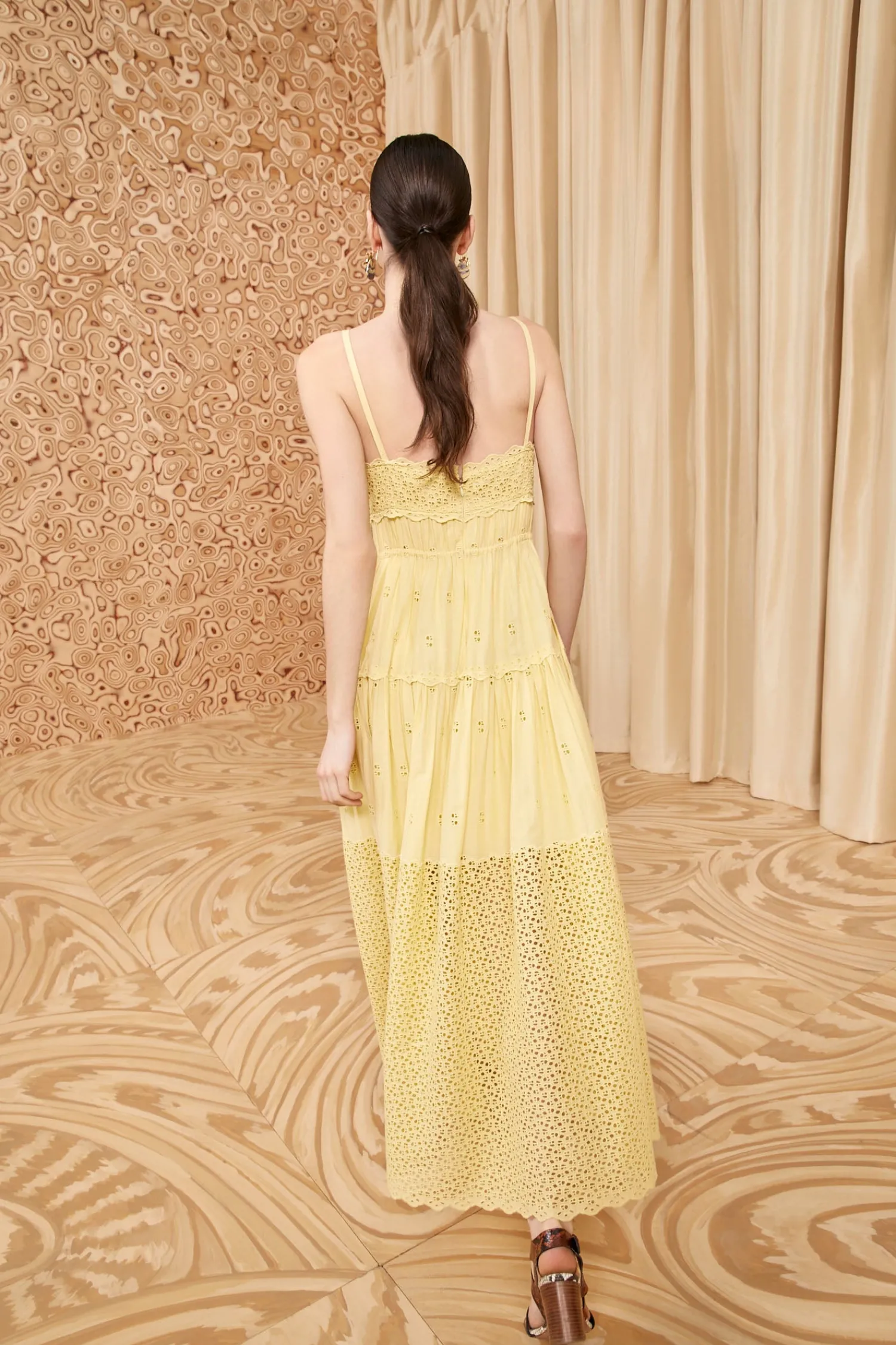 Arriving in a delightful pale yellow, our Isadore Dress is beautifully tailored from airy cotton voile that’s adorned with eyelets in scattered and concentrated geometries, displaying subtle hints of skin. Suspended from pin-thin straps, this effortless lovely has a drawstring waist and falls to a timeless midi silhouette. It fastens with a concealed back zipper.