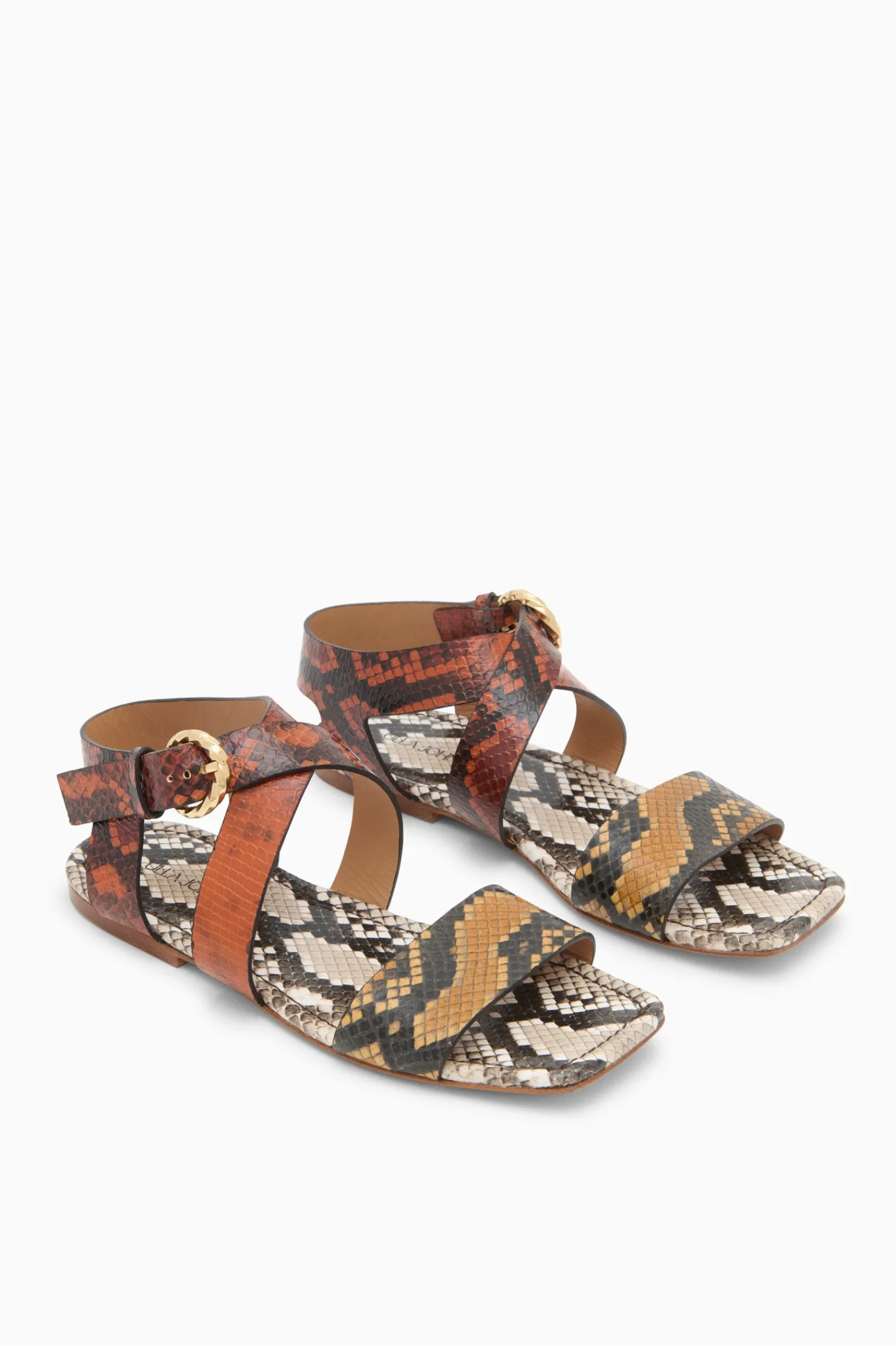 Adding texture and dimension to any look, our Iyla Flat arrives made in Italy from leather that’s richly embossed with python motifs. These sandals feature an open, square-toe silhouette with wide straps and fasten with a buckle twisted from gleaming antique brass.