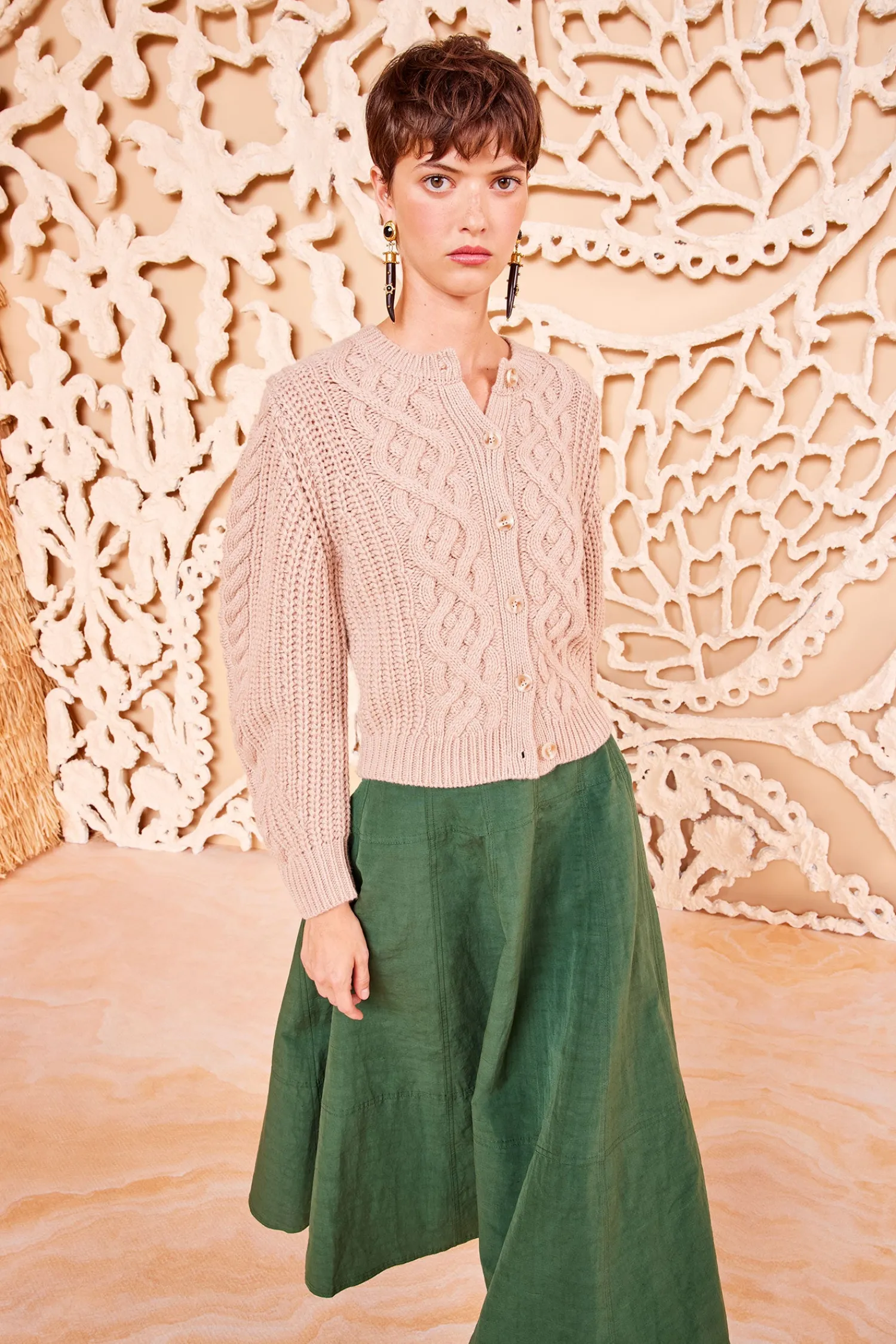 A luxe wardrobe essential, the Jodi Cardigan is spun from cozy beige cashmere with intricate cable motifs. It has a classic round neckline, voluminous long sleeves, and fastens with buttons through the front.