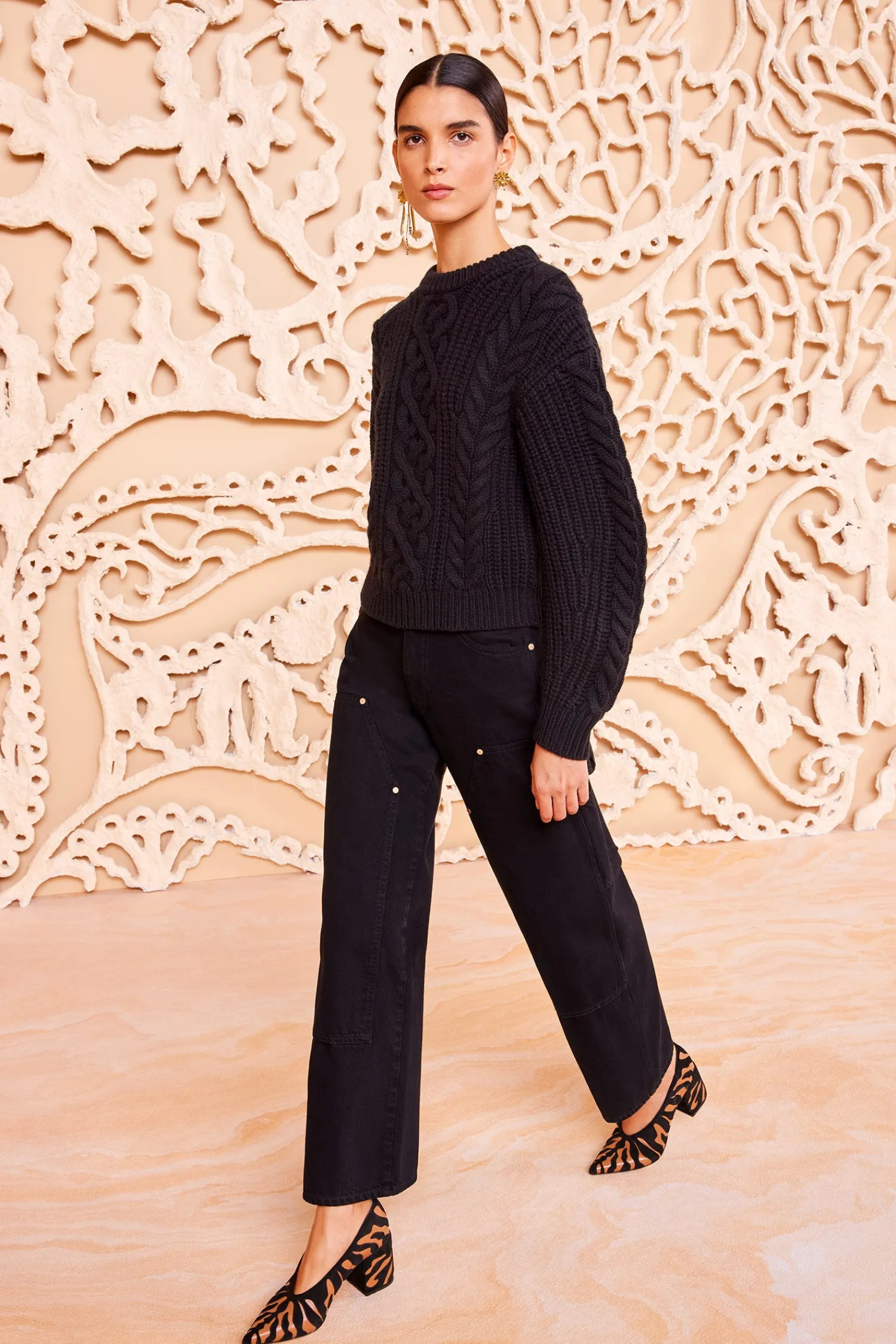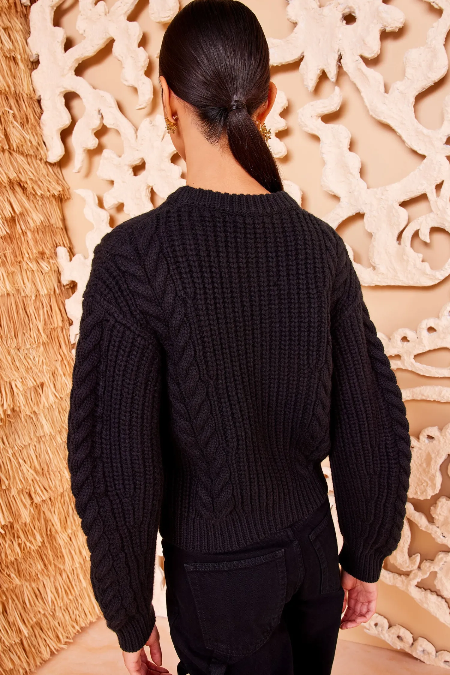 Our cozy Juniper Pullover is made from luxe black cashmere that comes alive with gorgeous cable motifs. This classic sweater features a crewneck and has a relaxed fit with elegant volume through the sleeves.