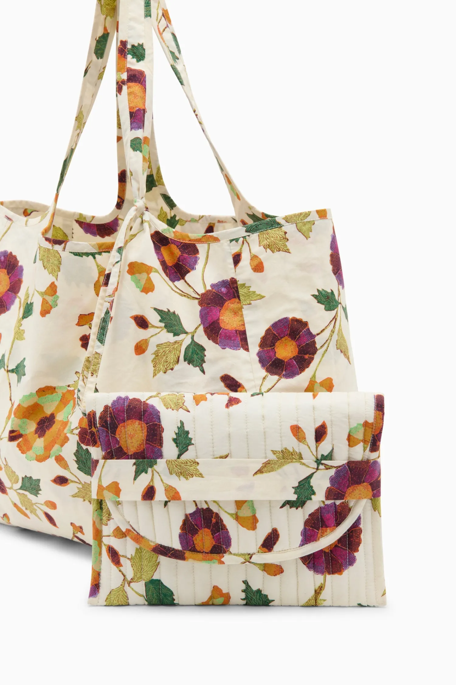 Exclusively ours, the Kamari Tote is made from floral cotton awash in cream, pink, and green hues. This carryall bag features a rounded double handle and comes with a separate to keep your essentials organized.