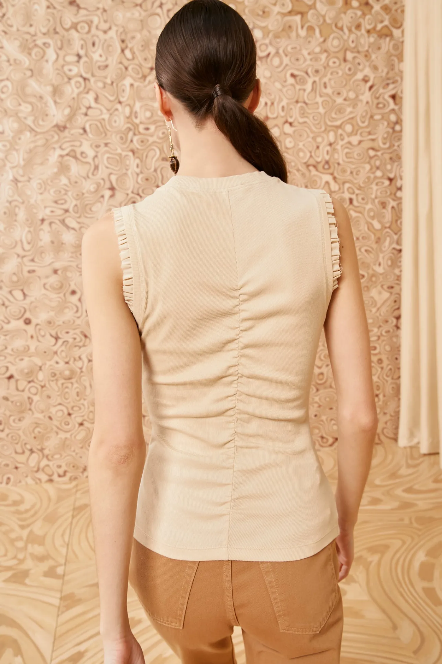 Refined yet beautifully detailed, our Kyla Top is a sleeveless essential with a timeless crewneck, raw-edge poplin ruffles at the sleeves, and ruching that lightly sculpts. Designed for a close fit, this khaki-hued style is made from finely ribbed organic cotton as part of our ongoing support of eco-friendly production methods.