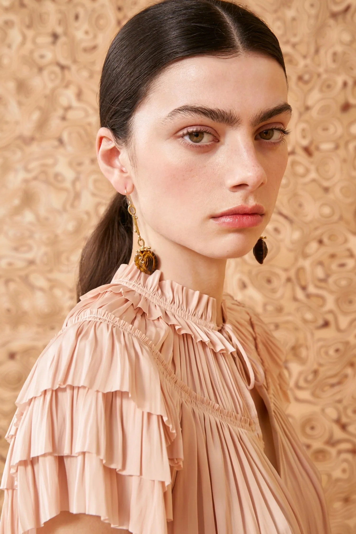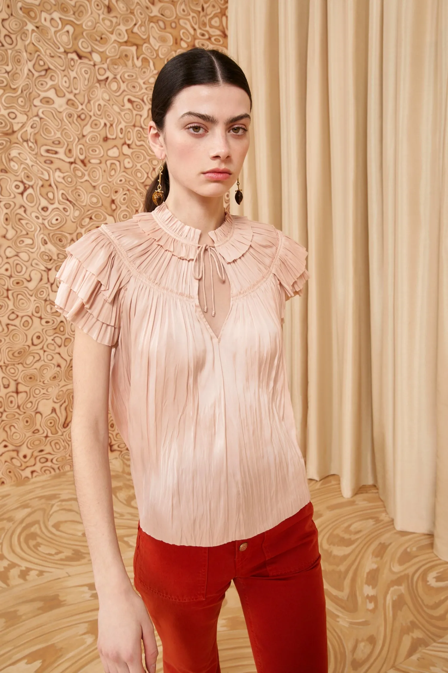Tinged the most delicate peony pink, the Liv Top is tailored from our beloved plissé satin that drapes so beautifully. It has gorgeous pleating and flutter sleeves that create a romantic cape-effect, and has ties you can leave undone or fastened into a delicate bow.