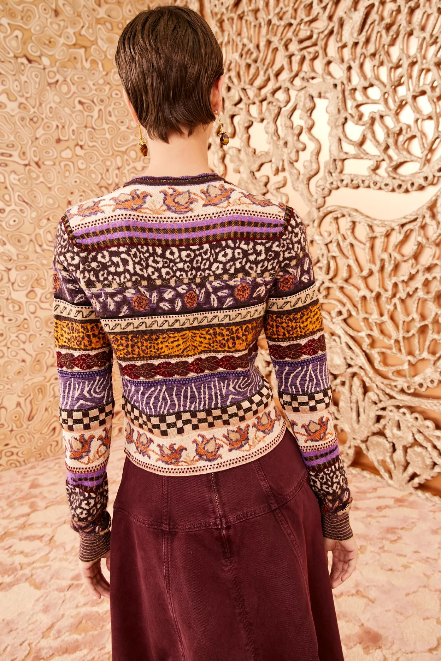An eye-catching essential, our Liza Cardigan is spun from mid-weight jacquard with a stunning display of Fair Isle motifs in vibrant purple and gold hues. Made with hints of wool and alpaca, this long-sleeve, button-down fits close to the body and has metallic yarns that add a glimmering touch.