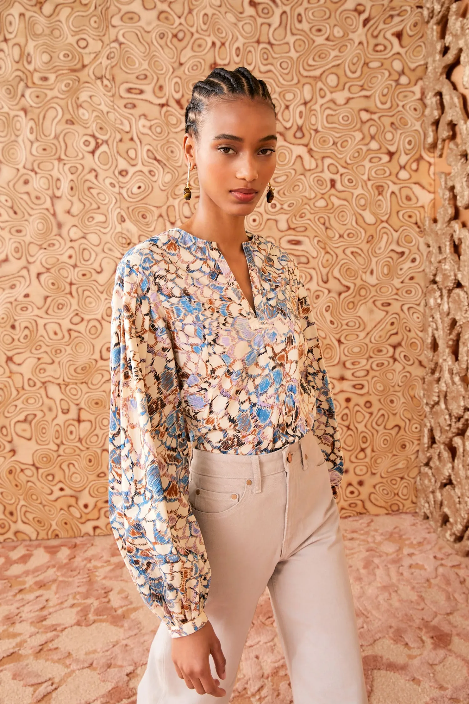 Our Ilara Blouse features our seasonal feathered print—an arresting blend of swirling motifs in blue, purple, and brown. Cut from cotton poplin, it has a notched neckline framed by long billowing sleeves and a simple, straight bodice, letting the print take centerstage.