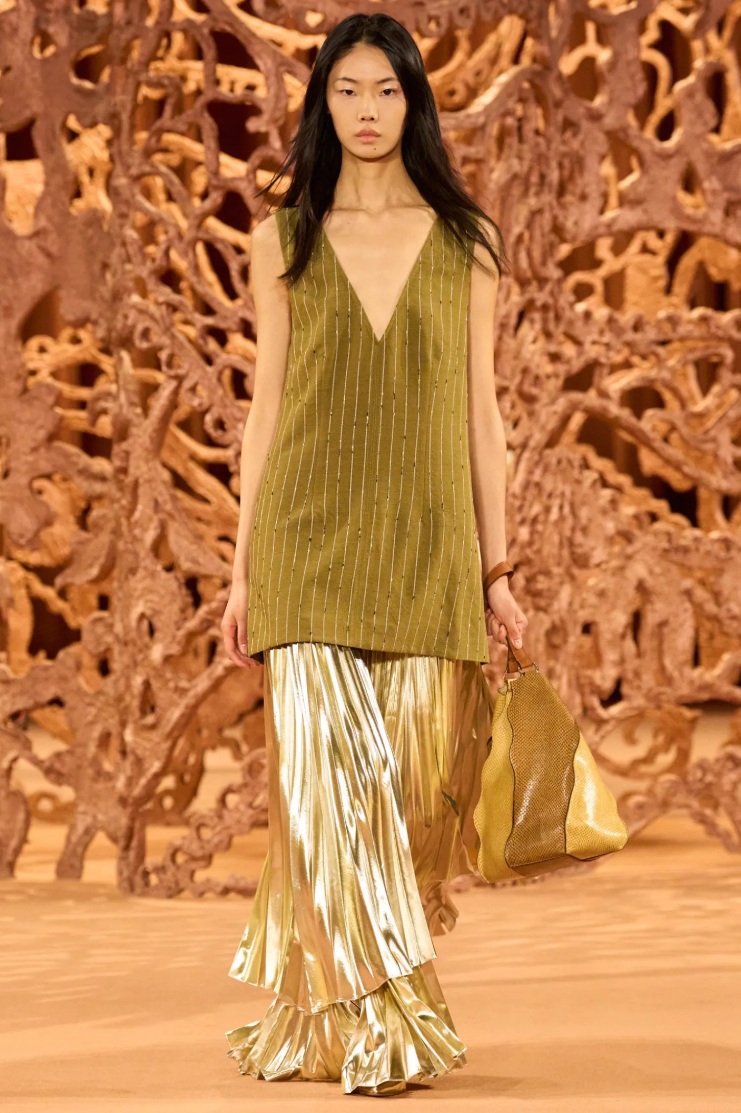 Featured in Look 44 of the Autumn/Winter 2024 runway show, the Marta Dress is cut from our Italian wool suiting with classic pinstripes and a slightly slubbed texture. This green mini dress features a dramatic V-neckline, a straight silhouette, and is perfect for wearing solo or layered for distinctive elegance. It is fully lined and fastens with a side zipper closure.