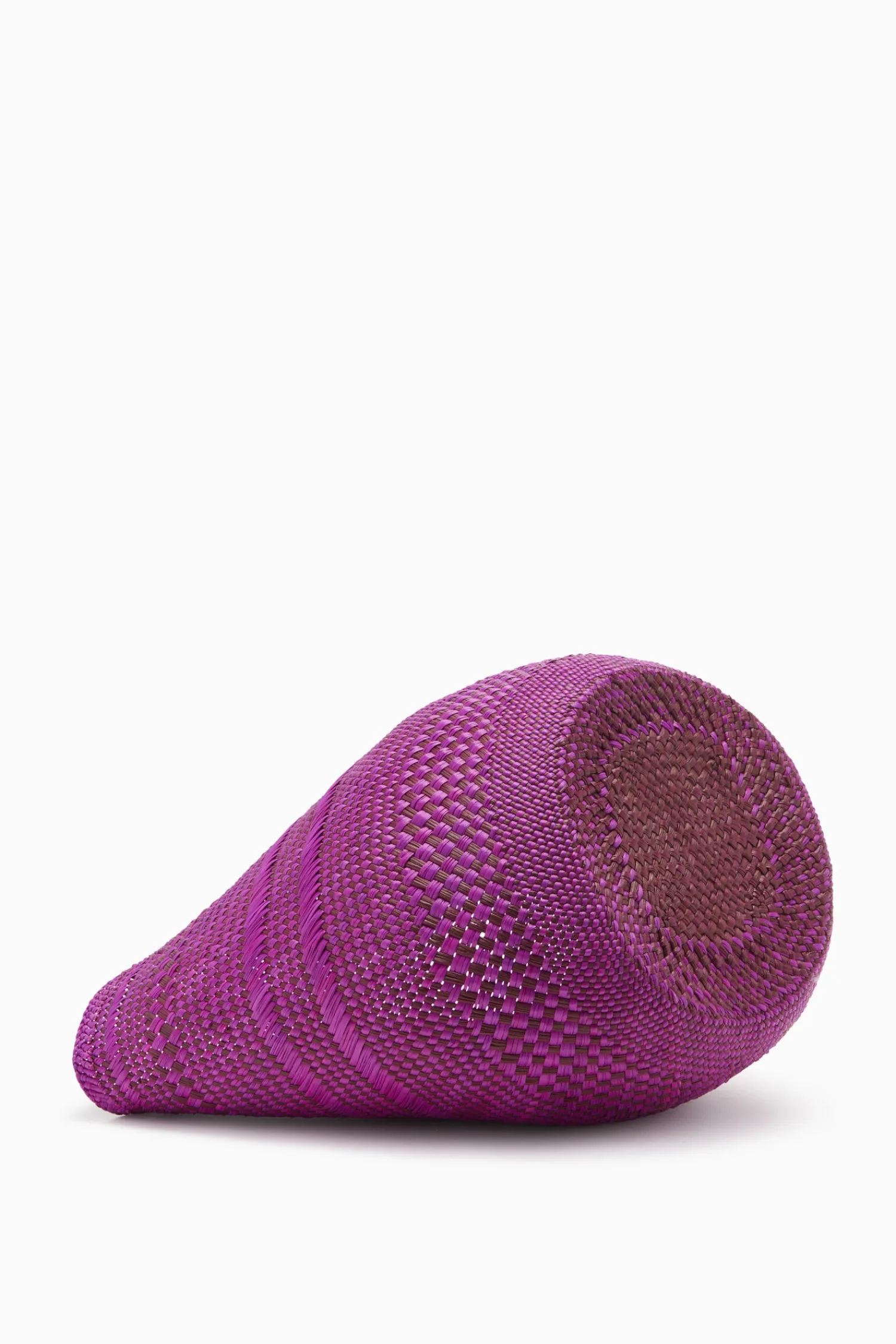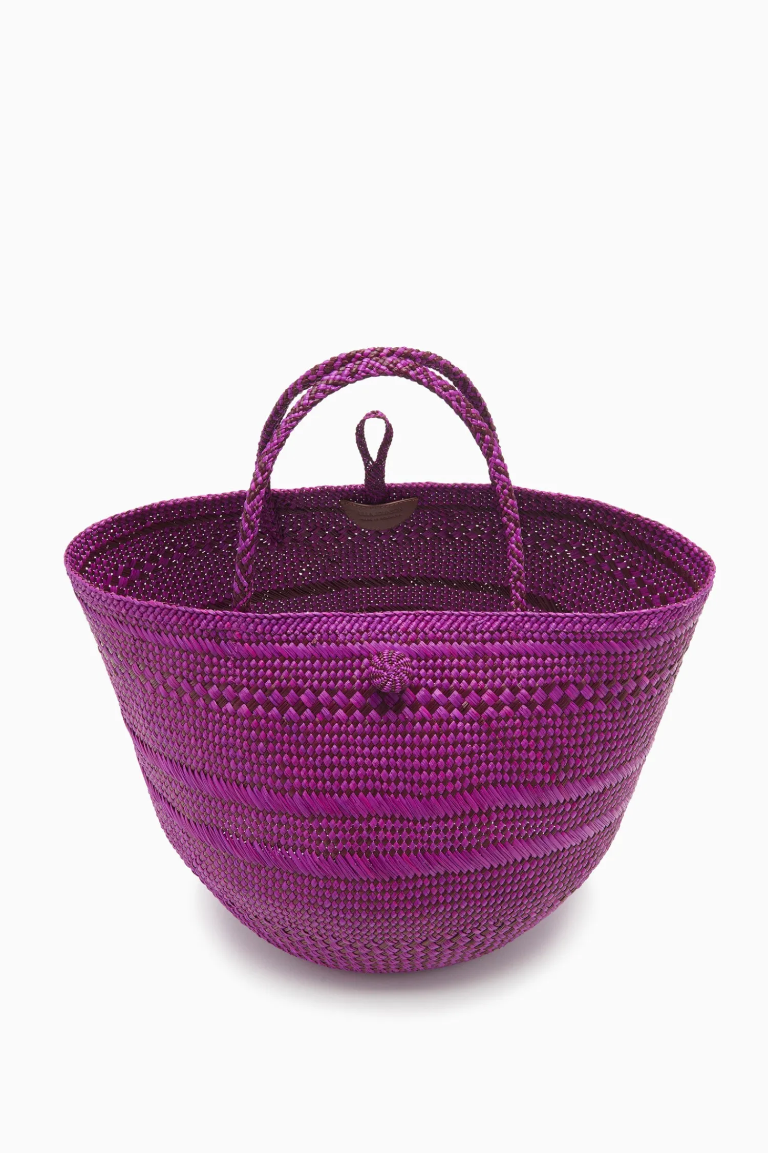 Hand-woven in Colombia from iraca palm, the Marta Large Basket Tote is a beach-ready beauty with intricately layered stripes in a rich and vibrant purple. Suspended from two top handles, it opens to a spacious interior with plenty of room for your towel, coverup, and a change of shoes. It easily slings over the shoulder and fastens with a button loop closure.