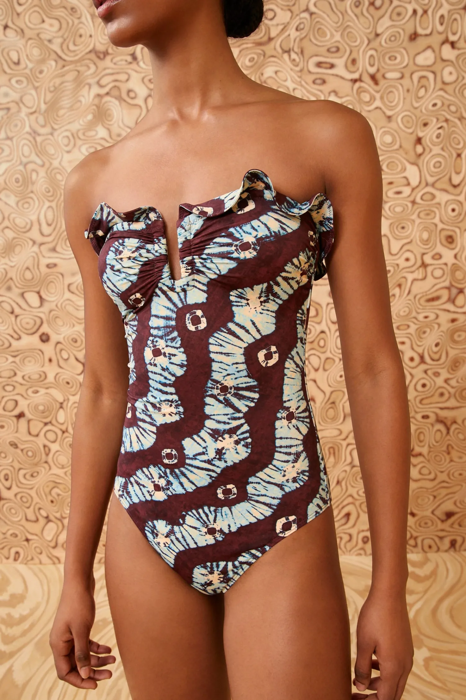 Our new Menorca Maillot is a strapless beauty trimmed with delicate ruffles at the top of the bust. A classic shibori print has been reimagined into a diagonal stripe with accent dots in graphic brown and blue. It has a notched front with boning at the sides for a secure fit and provides full coverage at the bottom.