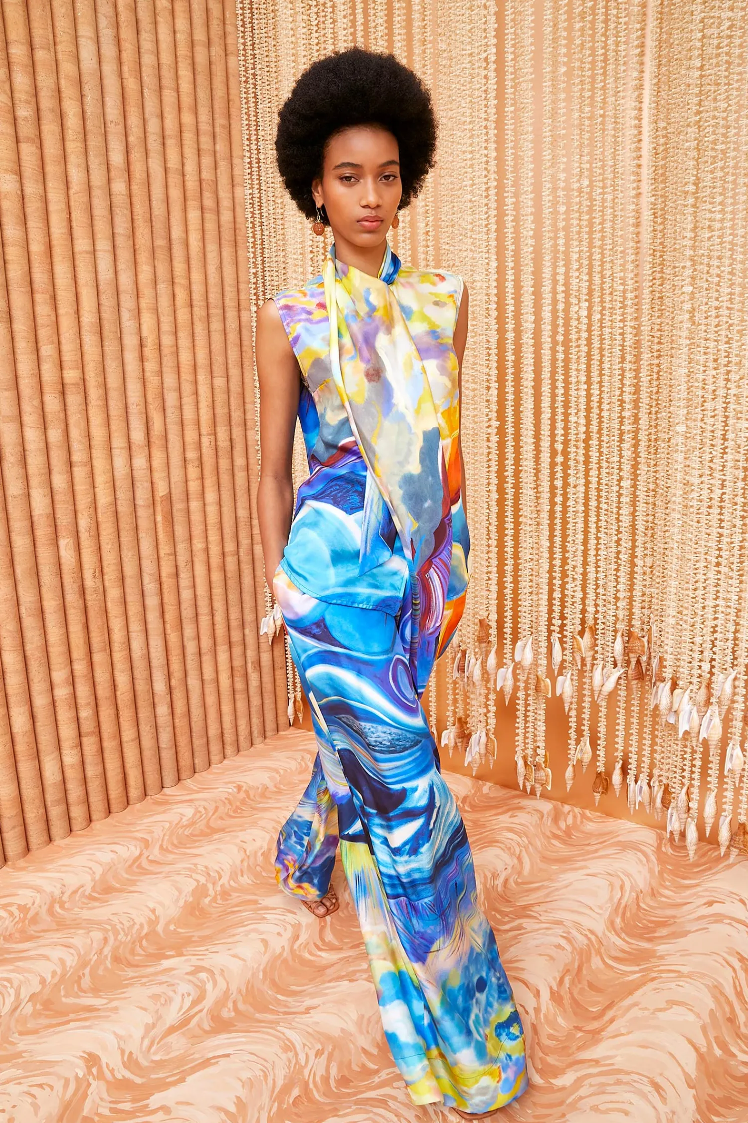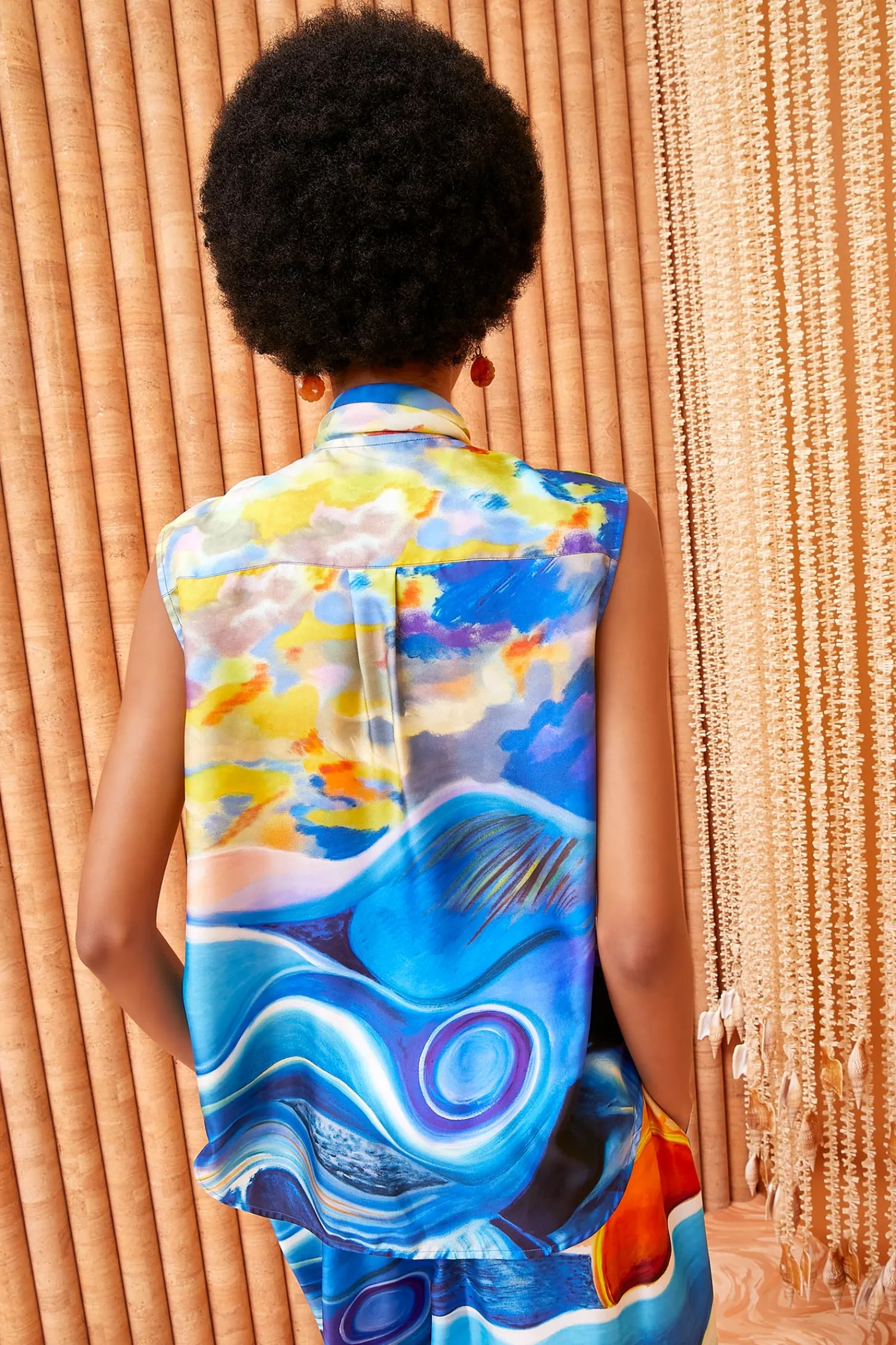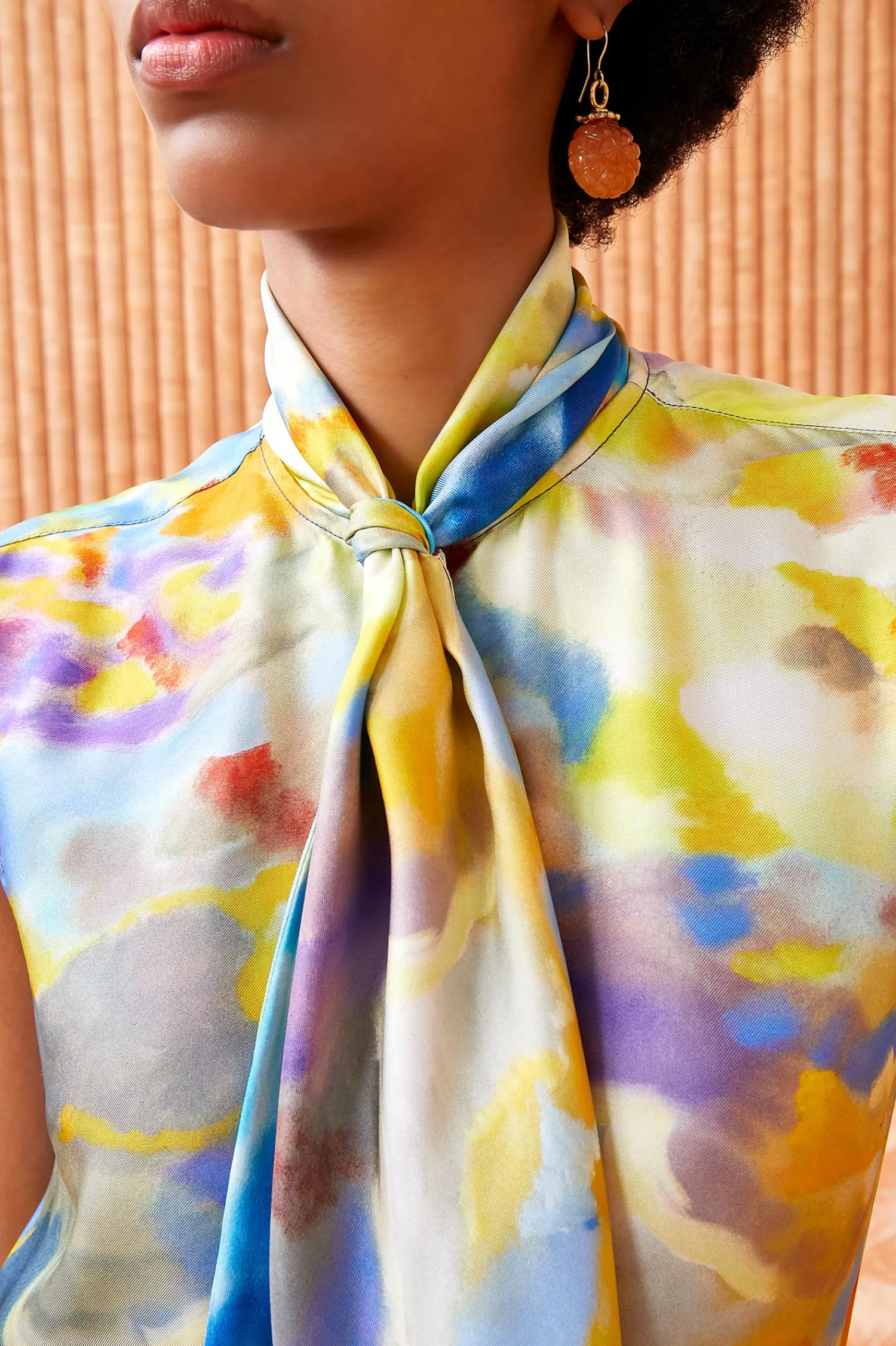 Featured in Look 2 of our Spring/Summer ‘24 Runway Show, our limited-edition Milo Top is part of our exclusive collaboration with celebrated painter Shara Hughes, whose dreamy 2021 sunset painting “Tuck” is translated across the silhouette in saturated yellow and blue hues. This silk twill piece has a sleeveless, flowy silhouette with scarf-like ties that drape loosely down the front. It fastens with a center-front button closure.