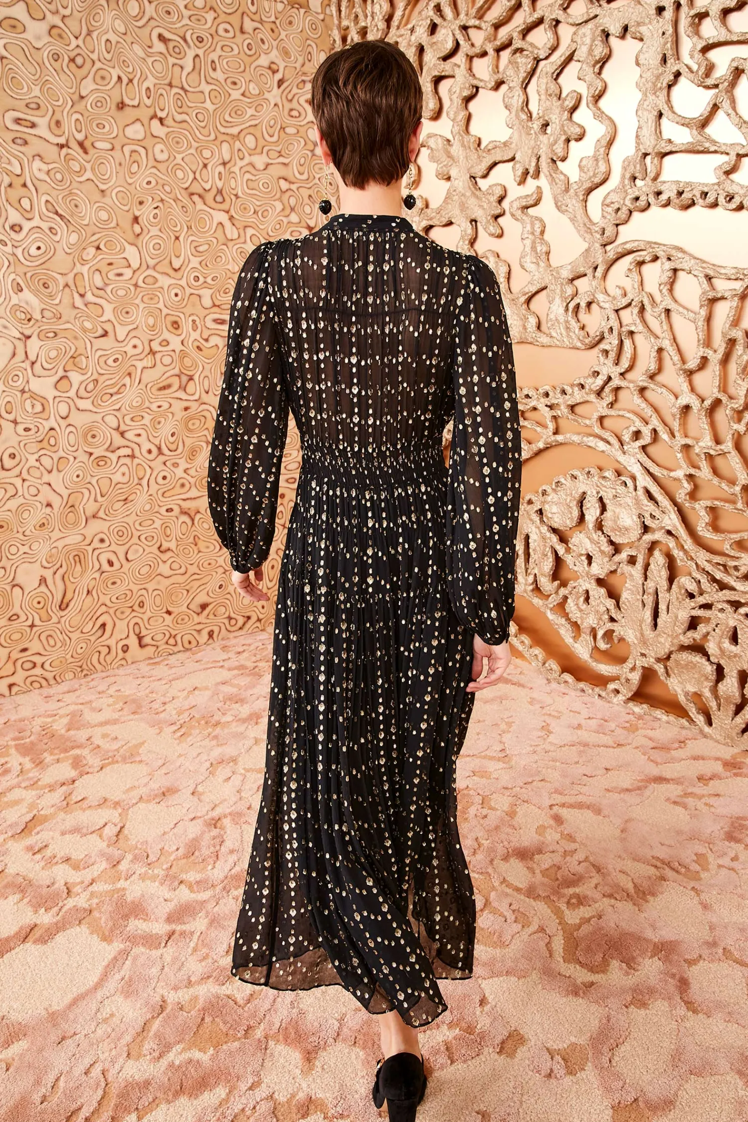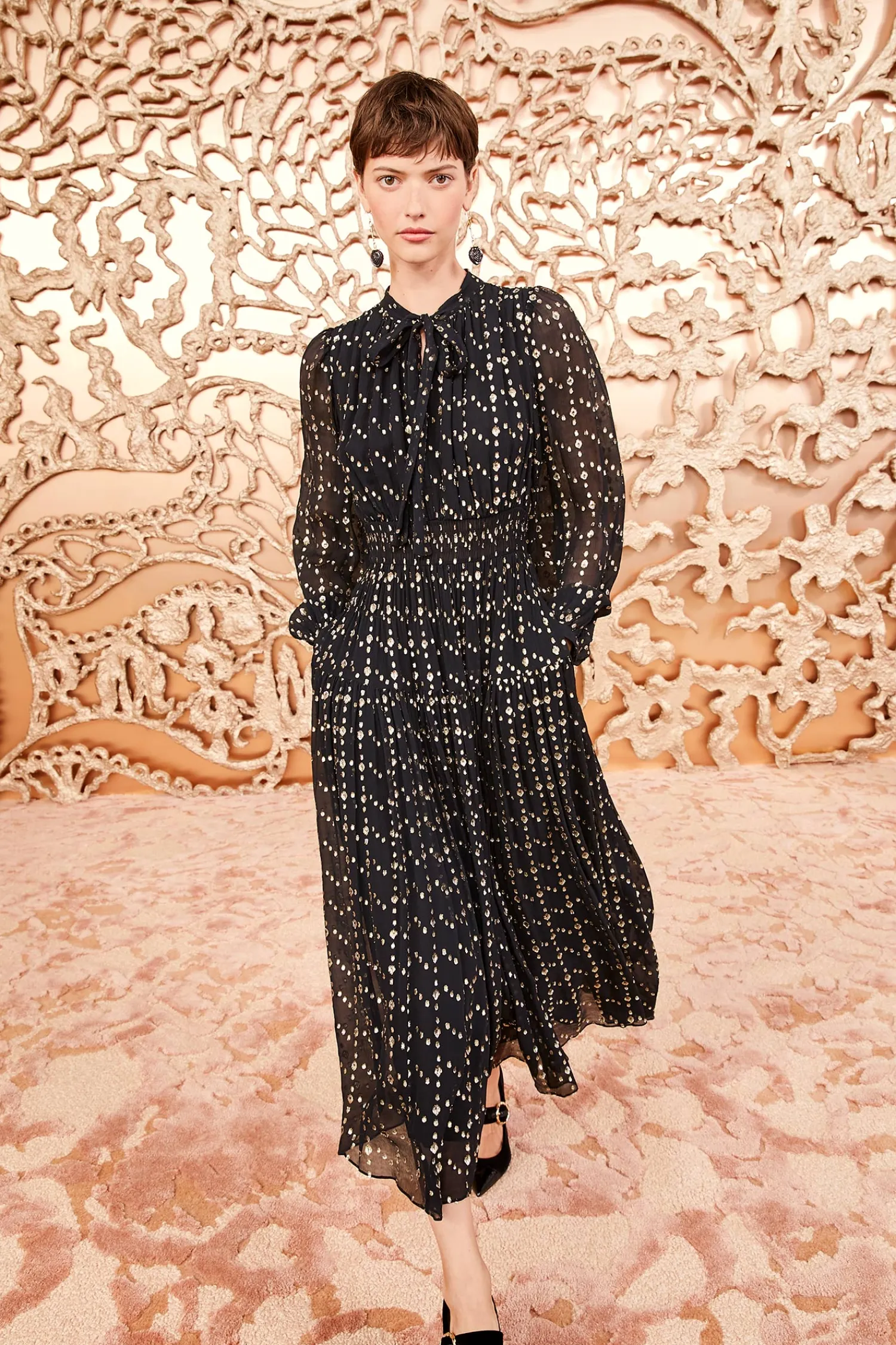 The Mona Dress arrives in gossamer crinkle chiffon that comes alive with shimmering lurex dots against a black backdrop. This midi-length lovely has long airy sleeves, neckties that fasten into a romantic bow, and an elastic waist that elegantly nips in. It has side pockets.