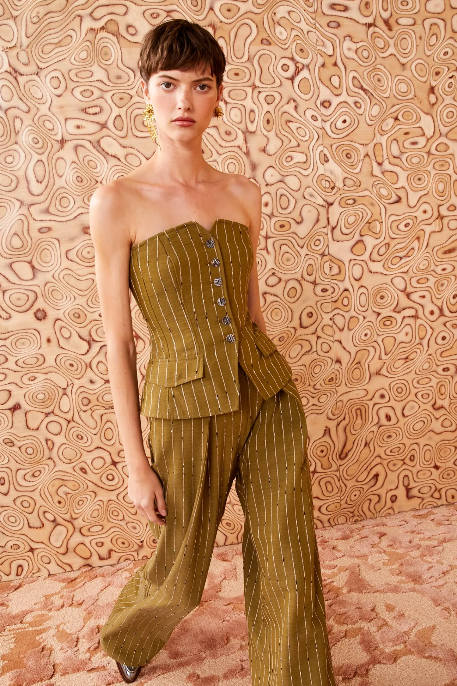 A key silhouette from Look 31 of our Autumn/Winter 2024 runway, the Noemie Top is masterfully tailored from Italian wool suiting with classic pinstripes and a slightly slubbed texture. Blurring the line between menswear and womenswear, this green strapless top nips in at the waist, has side pockets, and features a button front closure that beautifully details the silhouette. It has an internal bustier with a zipper, creating a secure and flattering fit.