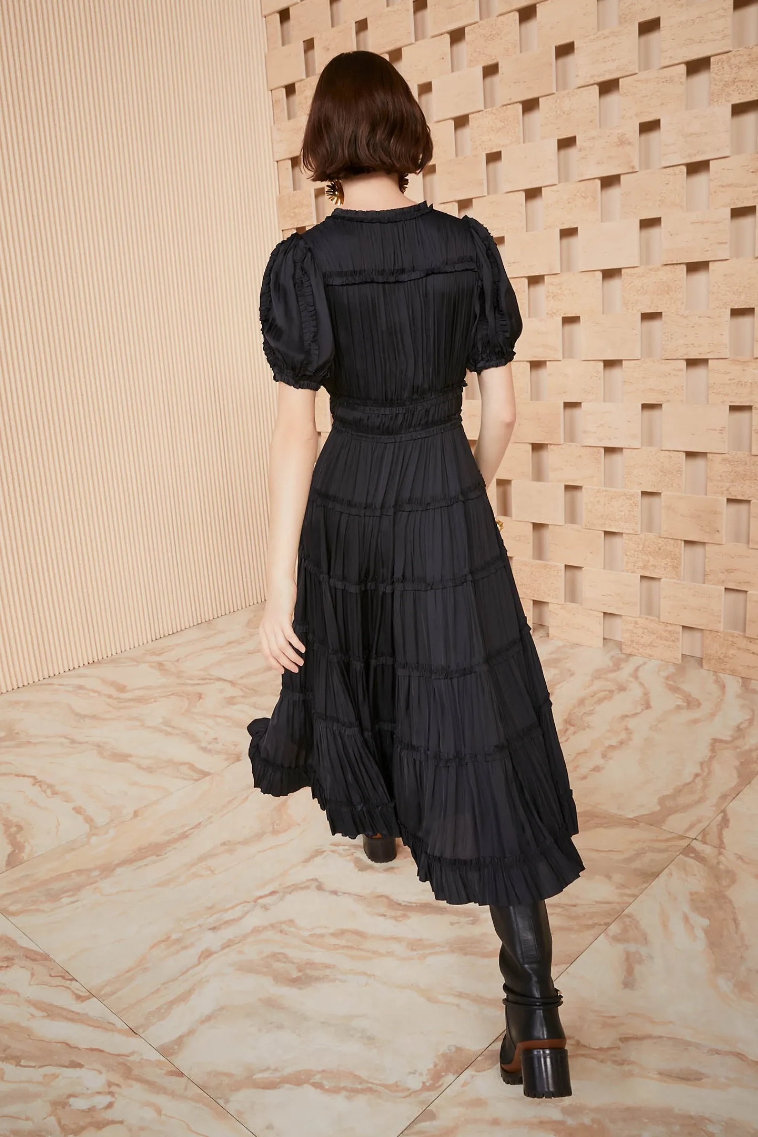 The Olivia Dress is crafted in our timeless plisse satin in classic Noir. A plunging neckline is framed with double-edged ruffles that bring added definition to this flattering silhouette. Features puff sleeves finished with an elastic cuff, midi-length skirt, and a side zip closure. This dress is unlined.