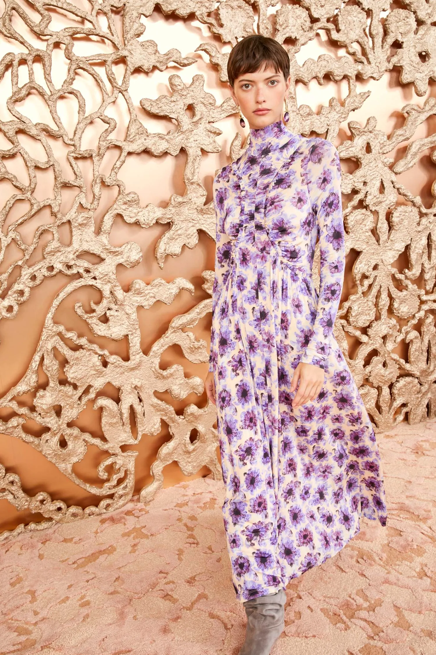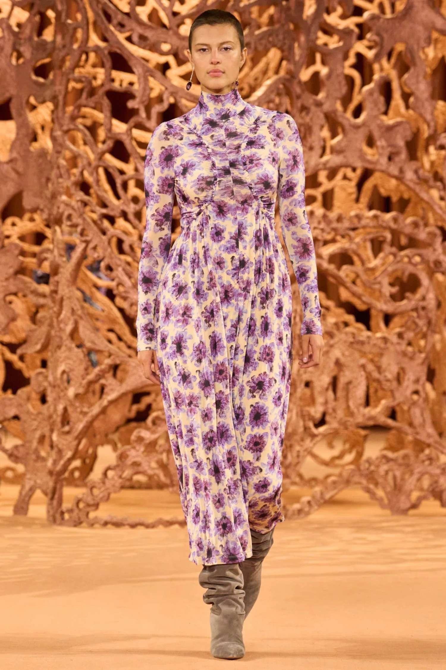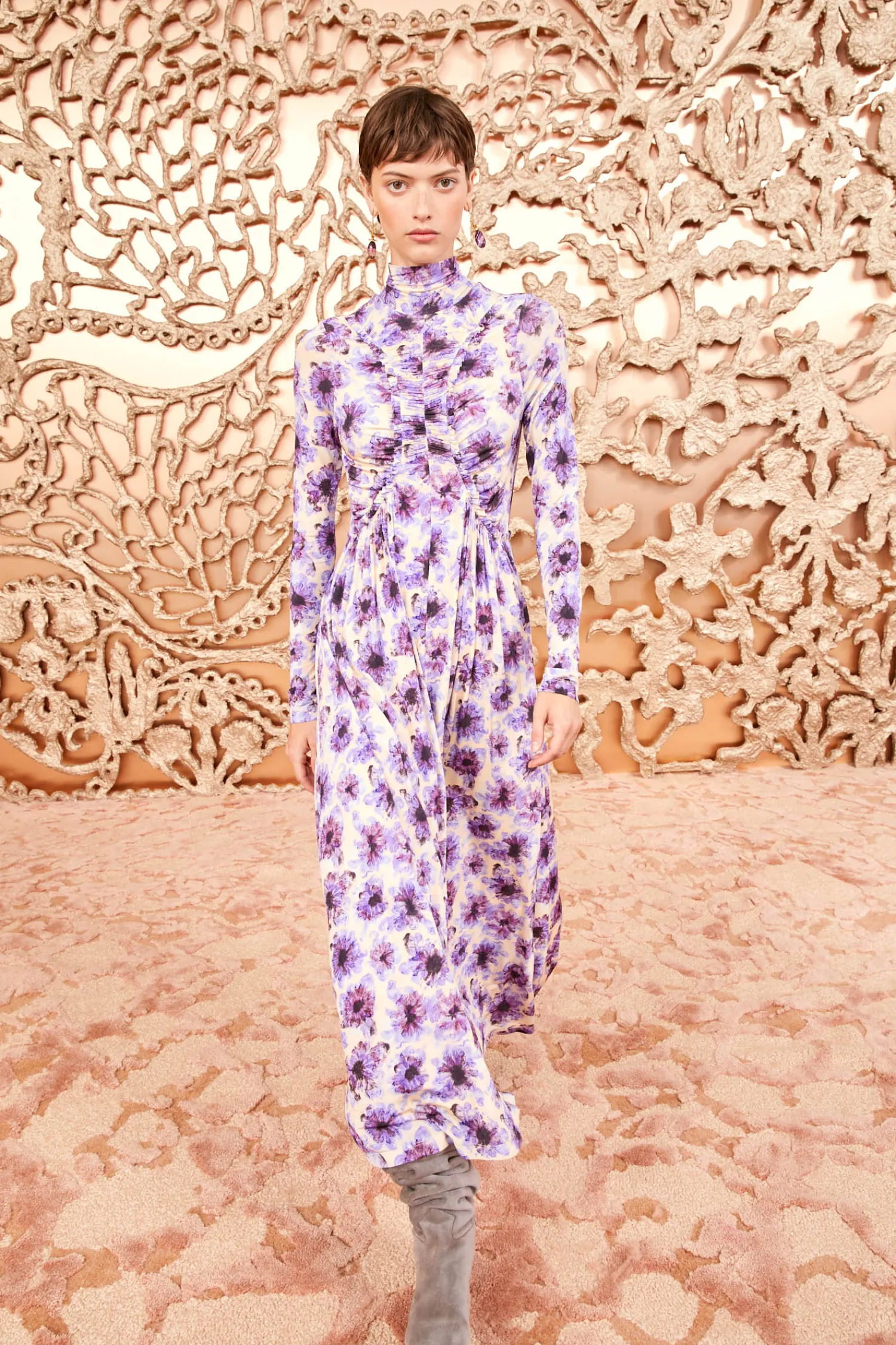 Featured in Look 20 on our Autumn/Winter 2024 runway, the Oriana Dress is cut from silken tricot jersey in our vibrant Wisteria floral print with dreamy purple tones. This body-skimming turtleneck frock has architectural seams, soft gathering, and long sleeves. It falls to a midi-length hem and fastens with a hidden zipper at the back.