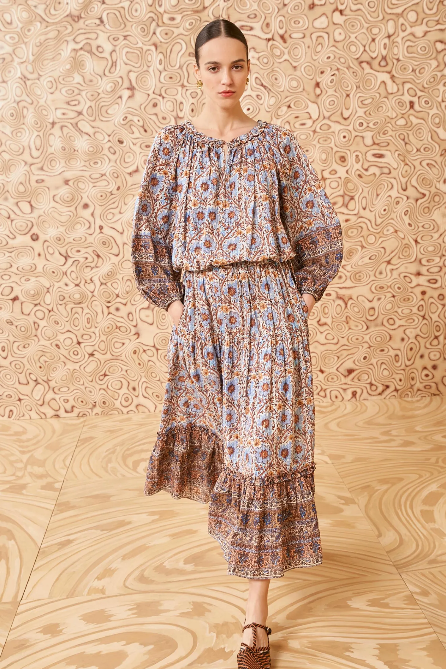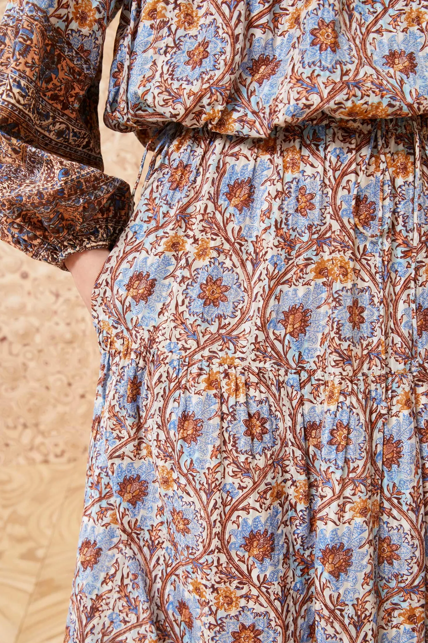 A floaty beauty, our Paige Skirt arrives in airy shadow stripe cotton with dynamic blooms rendered from a vintage Persian print—the natural blue, orange, and red hues mimic the natural dyes used in the original pattern. This midi-length style features a drawstring waist, side pockets, and pairs beautifully with our Silva Blouse.