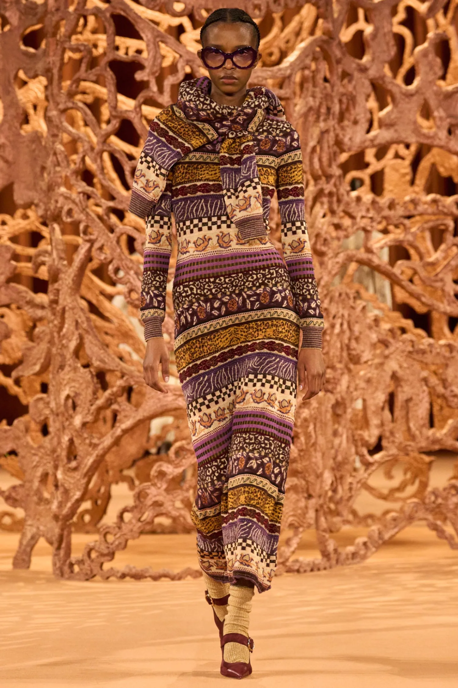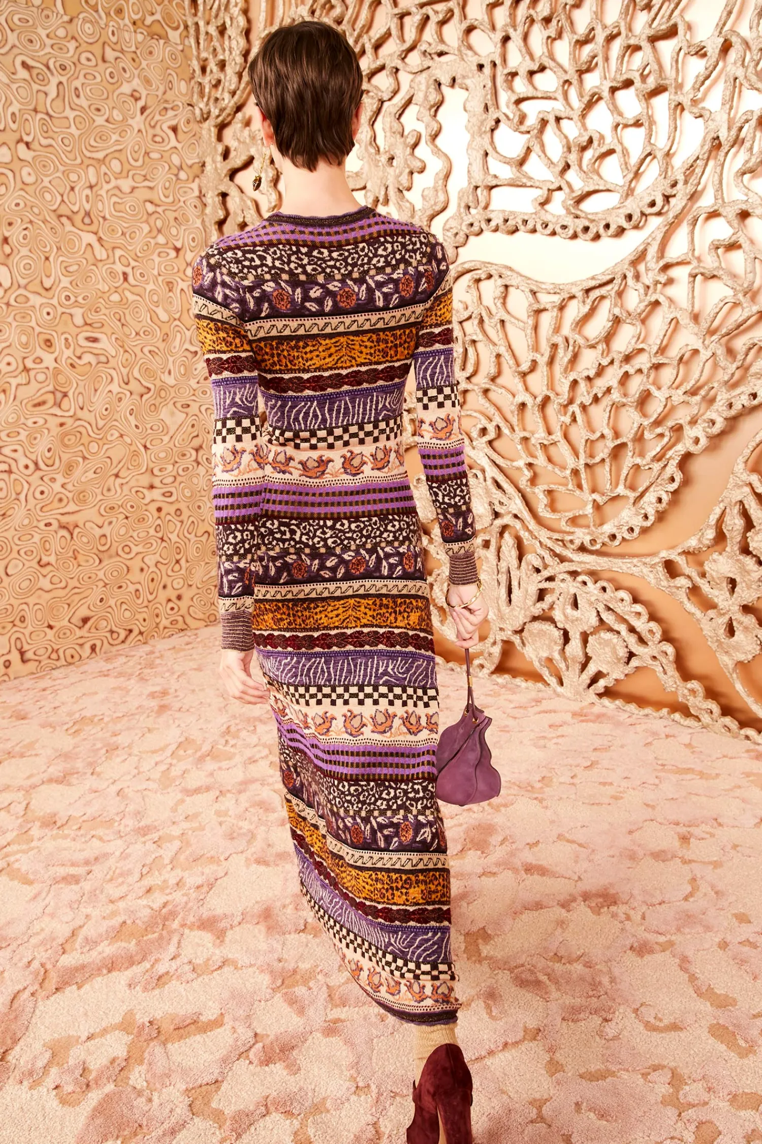Featured in Look 40 of our Autumn/Winter 2024 runway show, the Paloma Dress is crafted from mid-weight, plush yarn jacquard, inspired by Fair Isle motifs that incorporate a considered mélange of the season’s diverse patterns. This long-sleeve frock is alive with purple and golden hues and features a fitted silhouette with an ankle-grazing hemline.