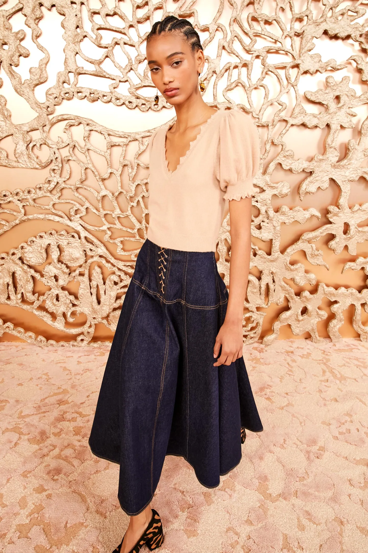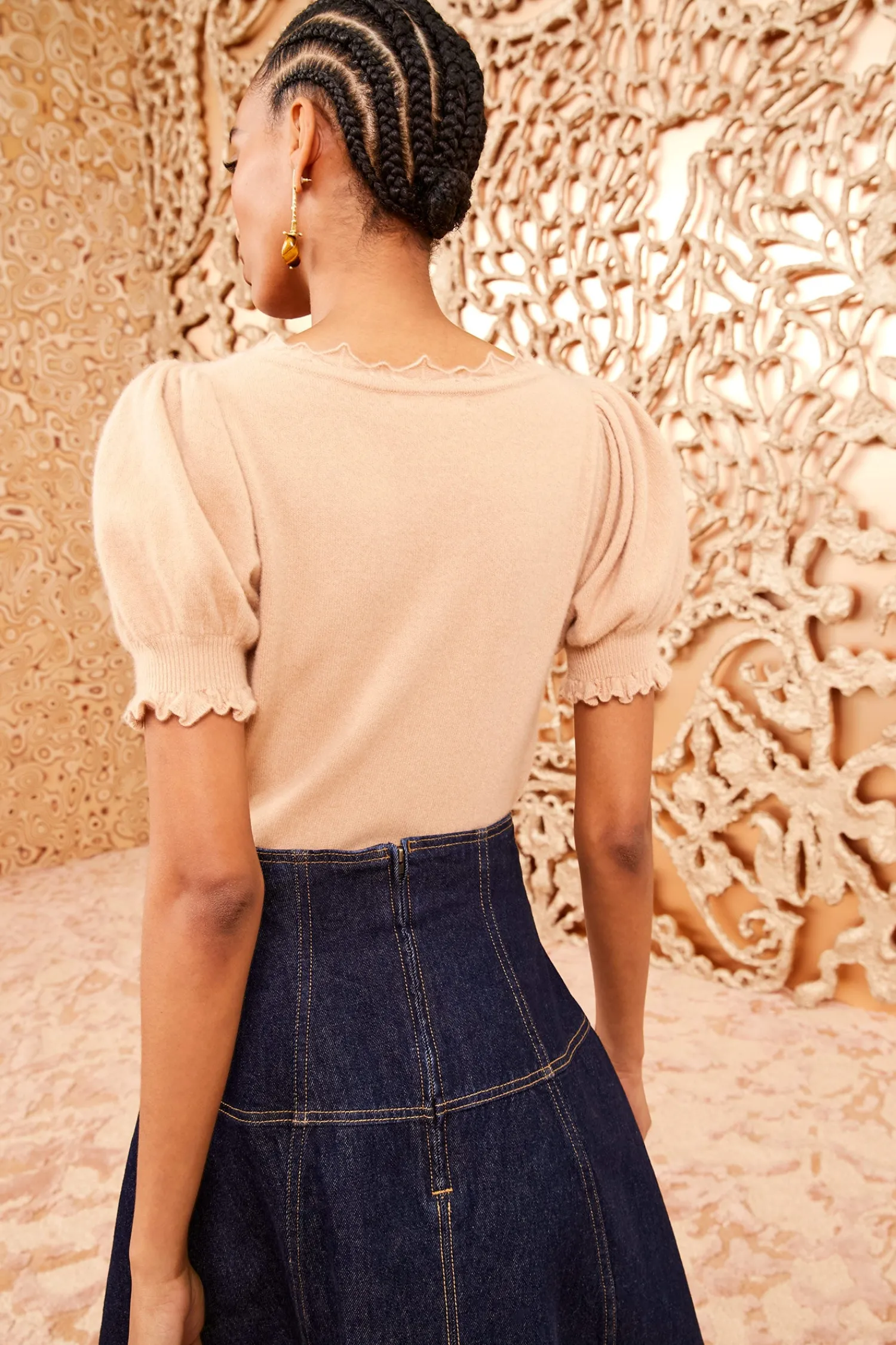 A luxe wardrobe foundation, our Polline Top is spun from the softest of cashmere in a wear-with-everything tan shade. It is framed by our signature puff sleeves and is finished with delicate frills at the V-neckline and cuffs, bringing visual intrigue to this refined silhouette.