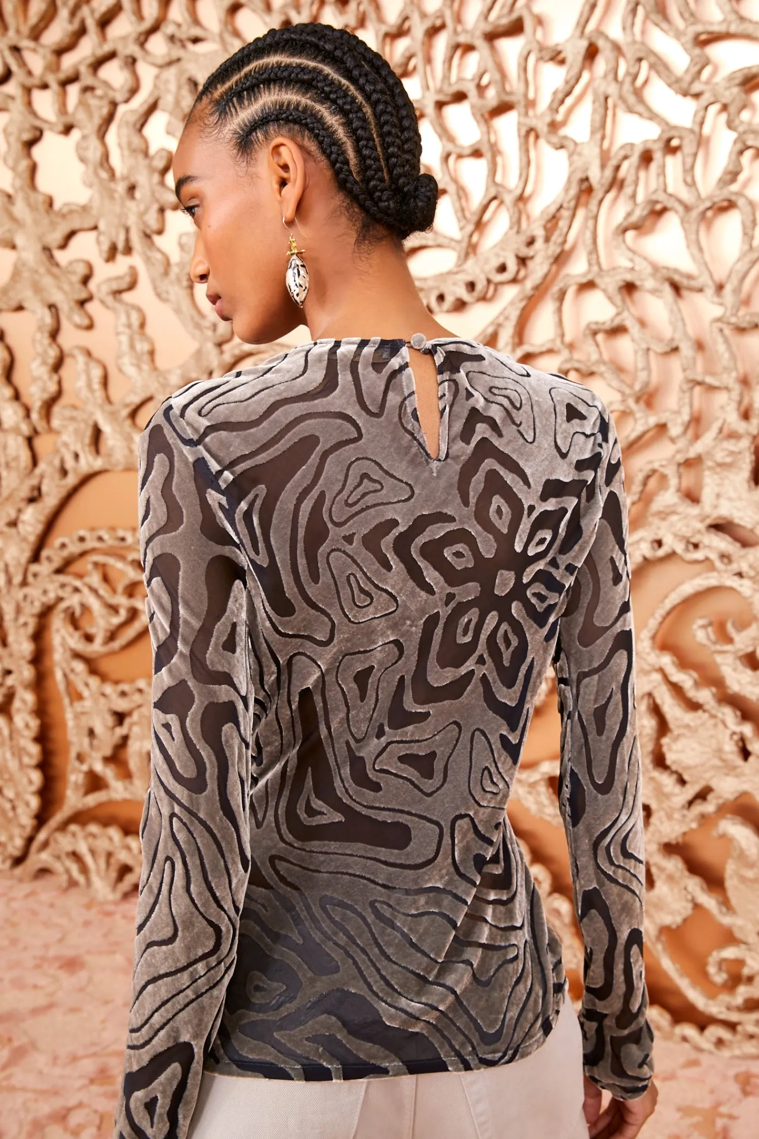 The Quinn Blouse is made from artful burnout velvet with floral motifs and wavy animal-like patterns that come alive. This luxurious, silver top has long sleeves, a round neckline, and is engineered with minimal seamlines, highlighting the beauty of the fabric. It fastens with a back buttoned keyhole.