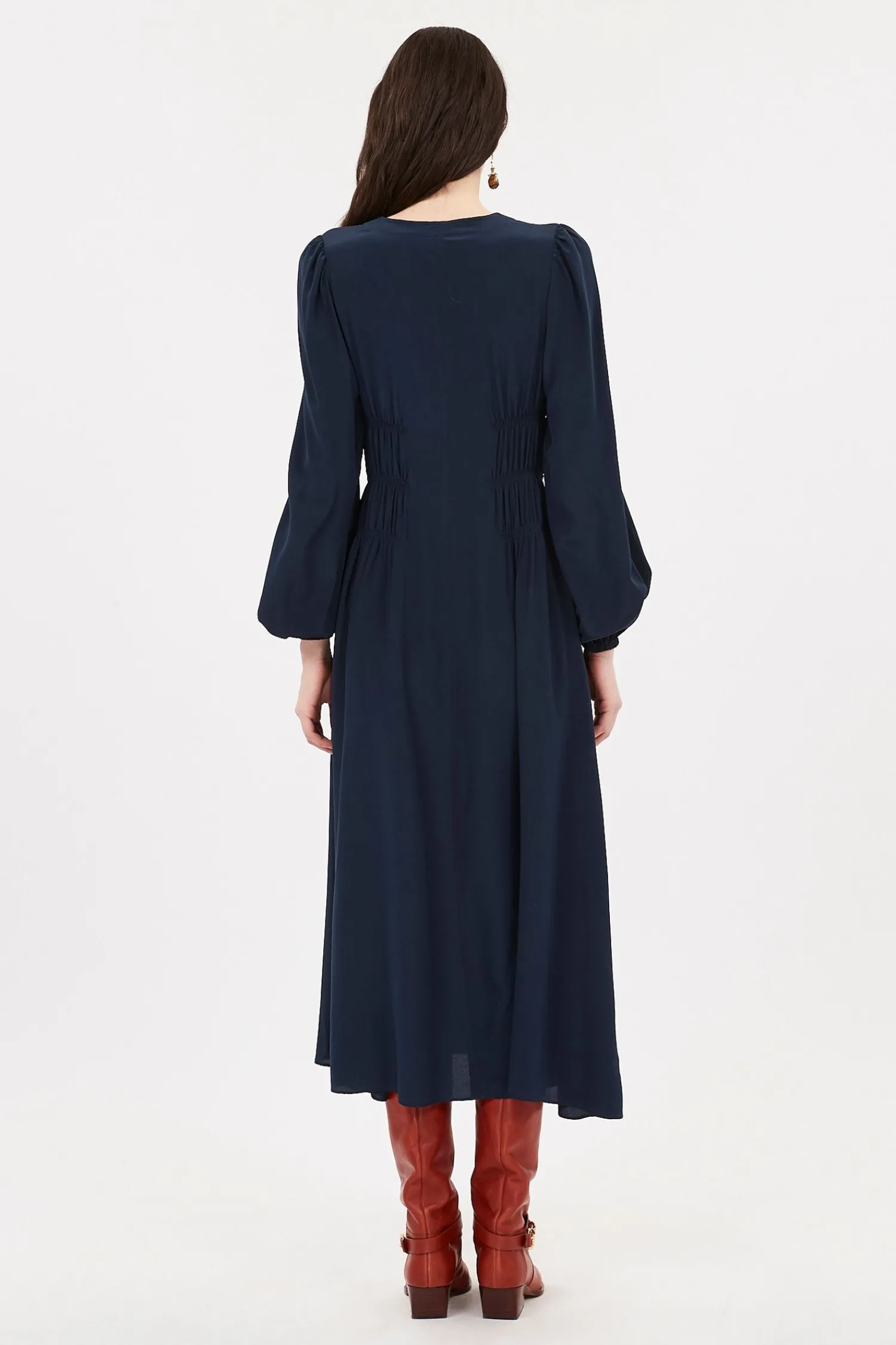 The Rouen Dress is a beautiful midnight blue midi-length style and has billowing long sleeves, a tie-neckline, and elastic gathers that beautifully nip in at the waist.