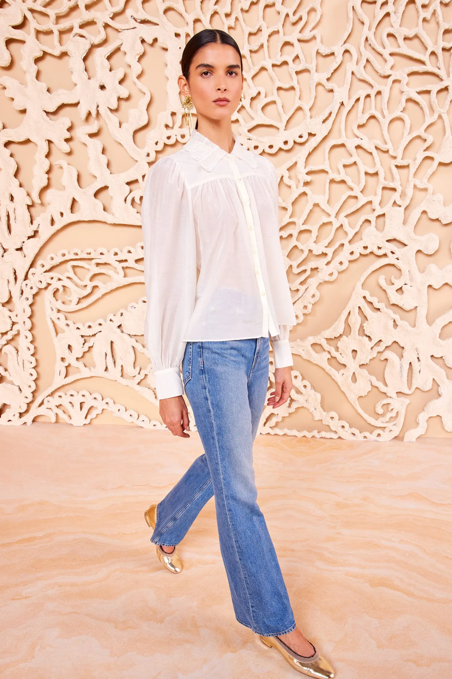 Our Rowan Blouse is a lightweight, ethereal beauty engineered at the collar with garden floral lace inspired by an antique textile. It is made from soft cotton-silk voile in pearly white and is delicately gathered at the yoke. It has long sleeves with buttoned cuffs and fastens with mother-of-pearl buttons at the front.