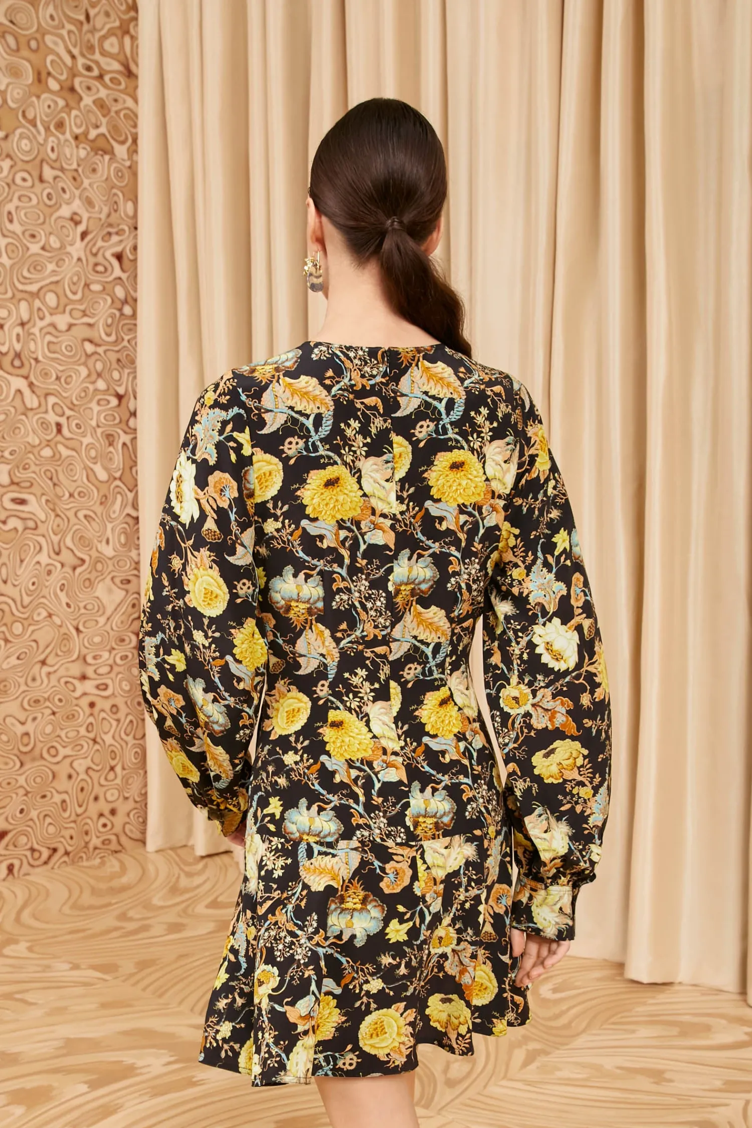 Our Salima frock delights with mesmeric blooms inspired by a 19th century French floral print. Dipped in noir and yellow hues, this mini silhouette is elevated with cascading ruffles and a gently fluted hemline. It has long sleeves, buttoned cuffs, and fastens with a concealed back zipper.