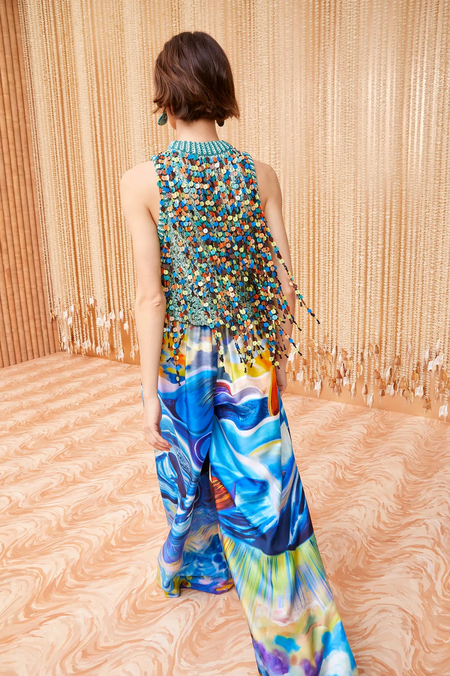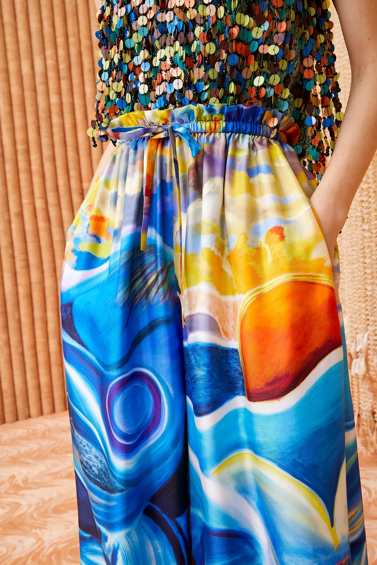 Featured in Look 2 on our Spring/Summer ‘24 runway, our forever favorite Sawyer Pant returns for the season as part of our exclusive collaboration with painter Shara Hughes, whose dreamy 2021 sunset painting “Tuck” is translated across the silk twill silhouette. Splashed with breathtaking blue and yellow hues, this fluid mid-rise style has an adjustable drawstring waistband, side slit pockets, and falls to a flattering wide leg.