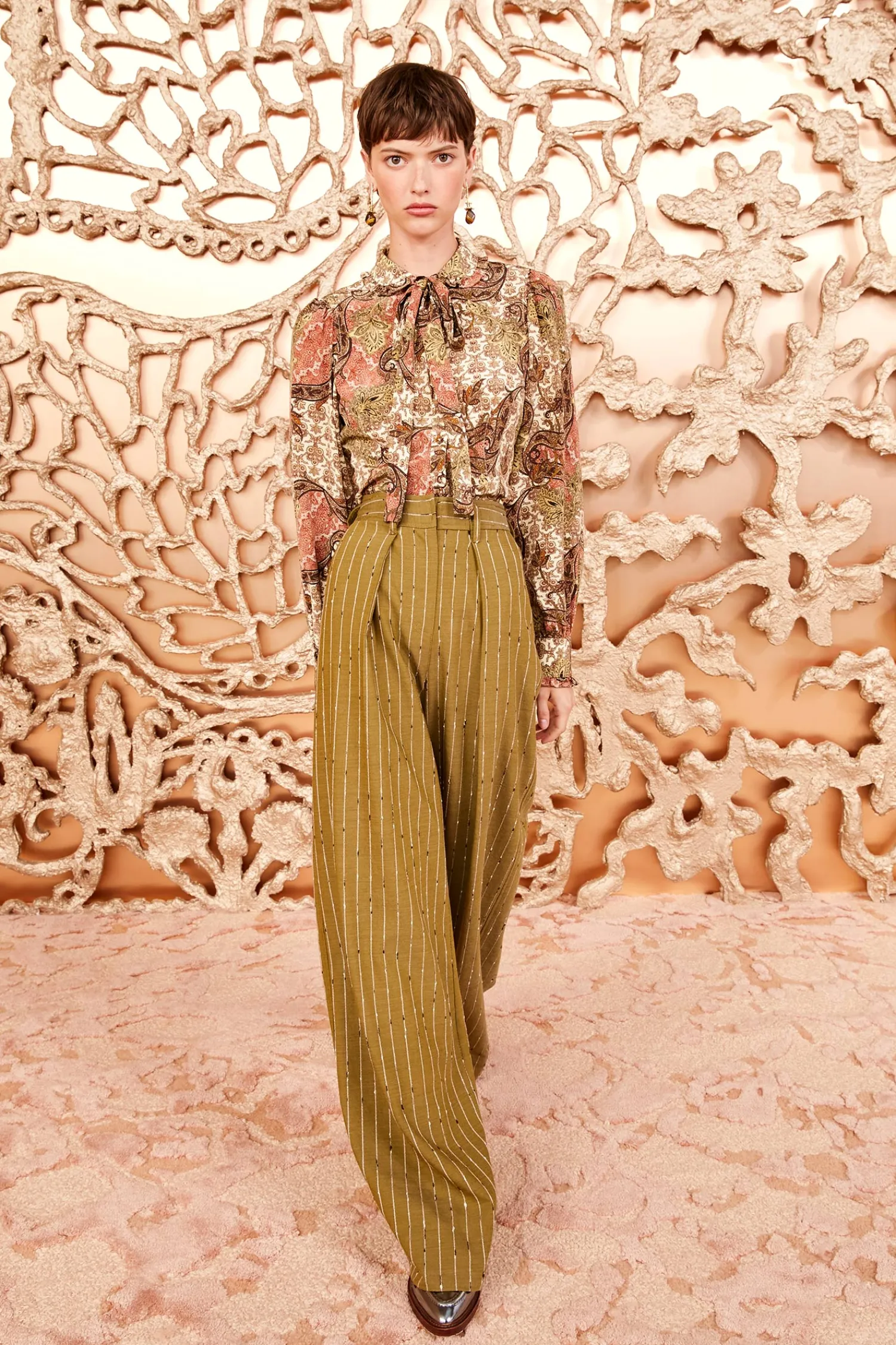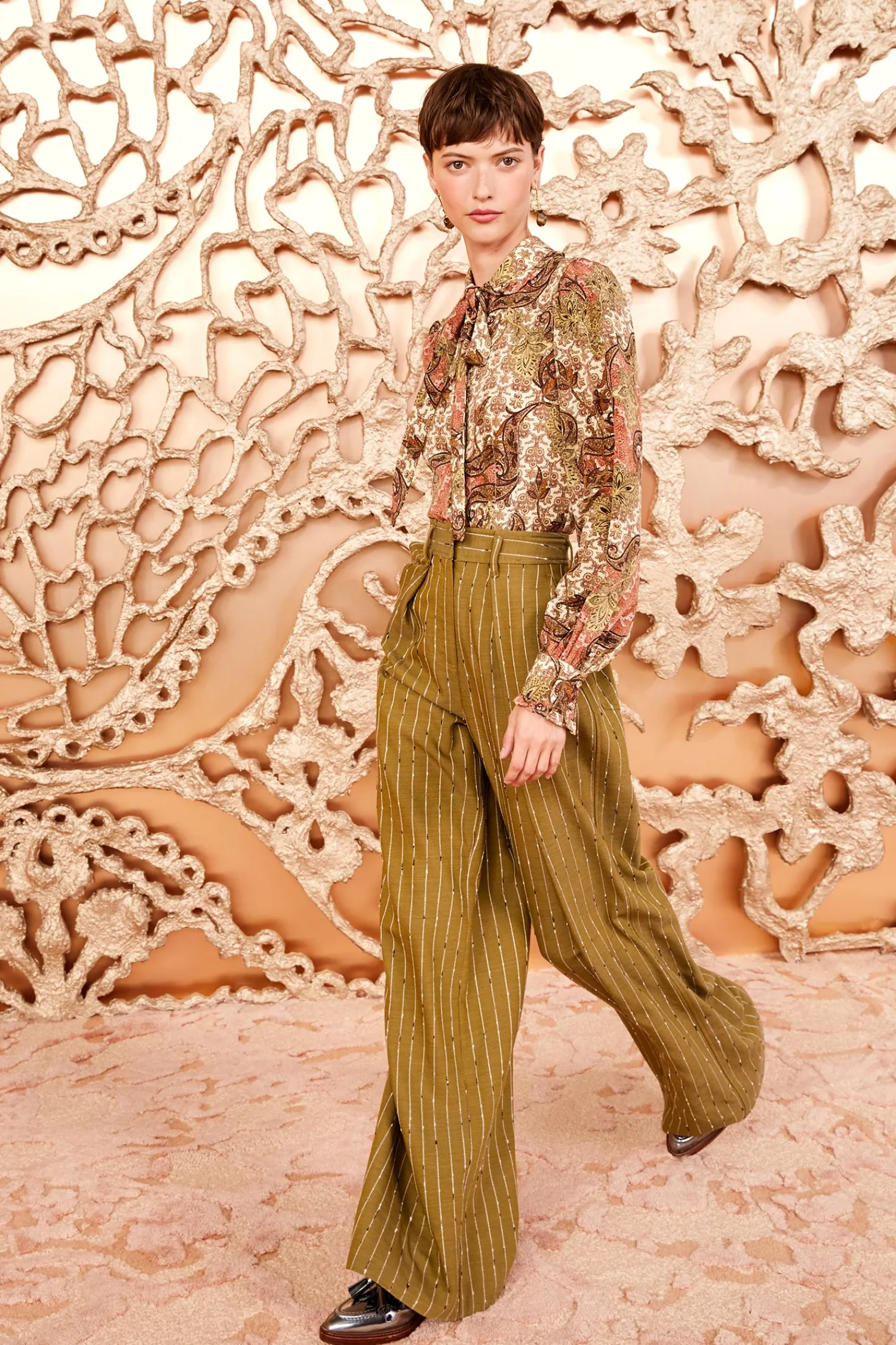 Featured in Look 31 of our Autumn/Winter 2024 runway, the Sylvie Pant is masterfully tailored from our Italian wool suiting with classic pinstripes and a slightly slubbed texture. Blending the lines between menswear and womenswear, this lightly pleated, green style is elegantly slouched and oversized. It fastens with a concealed button, hook, and zipper at the front.