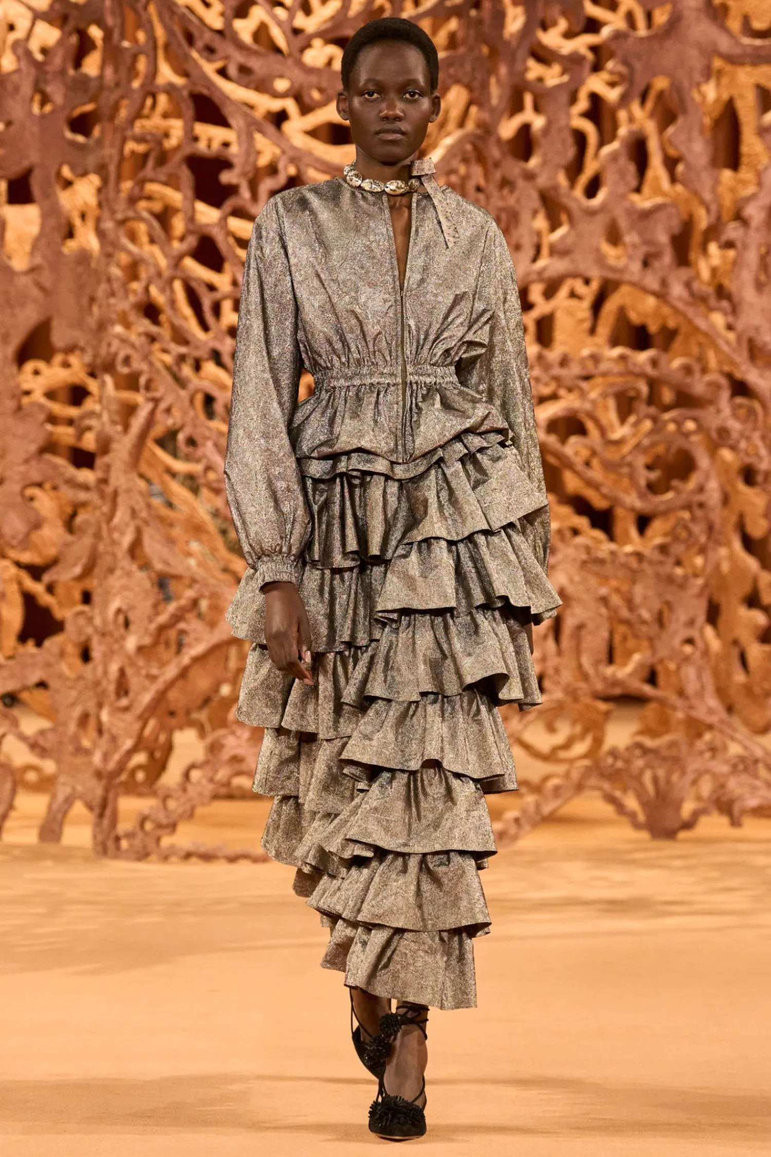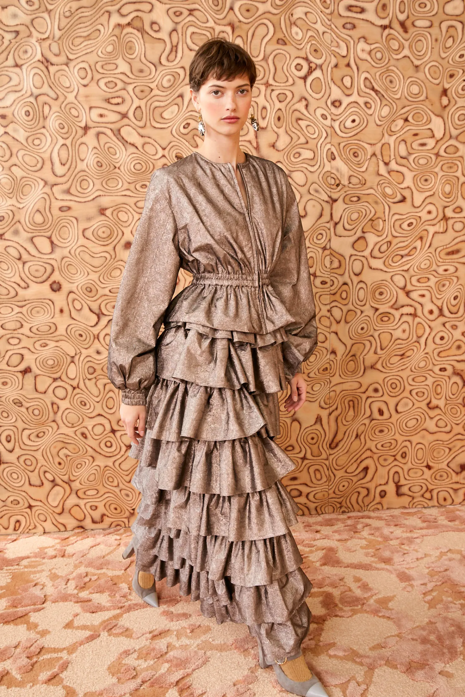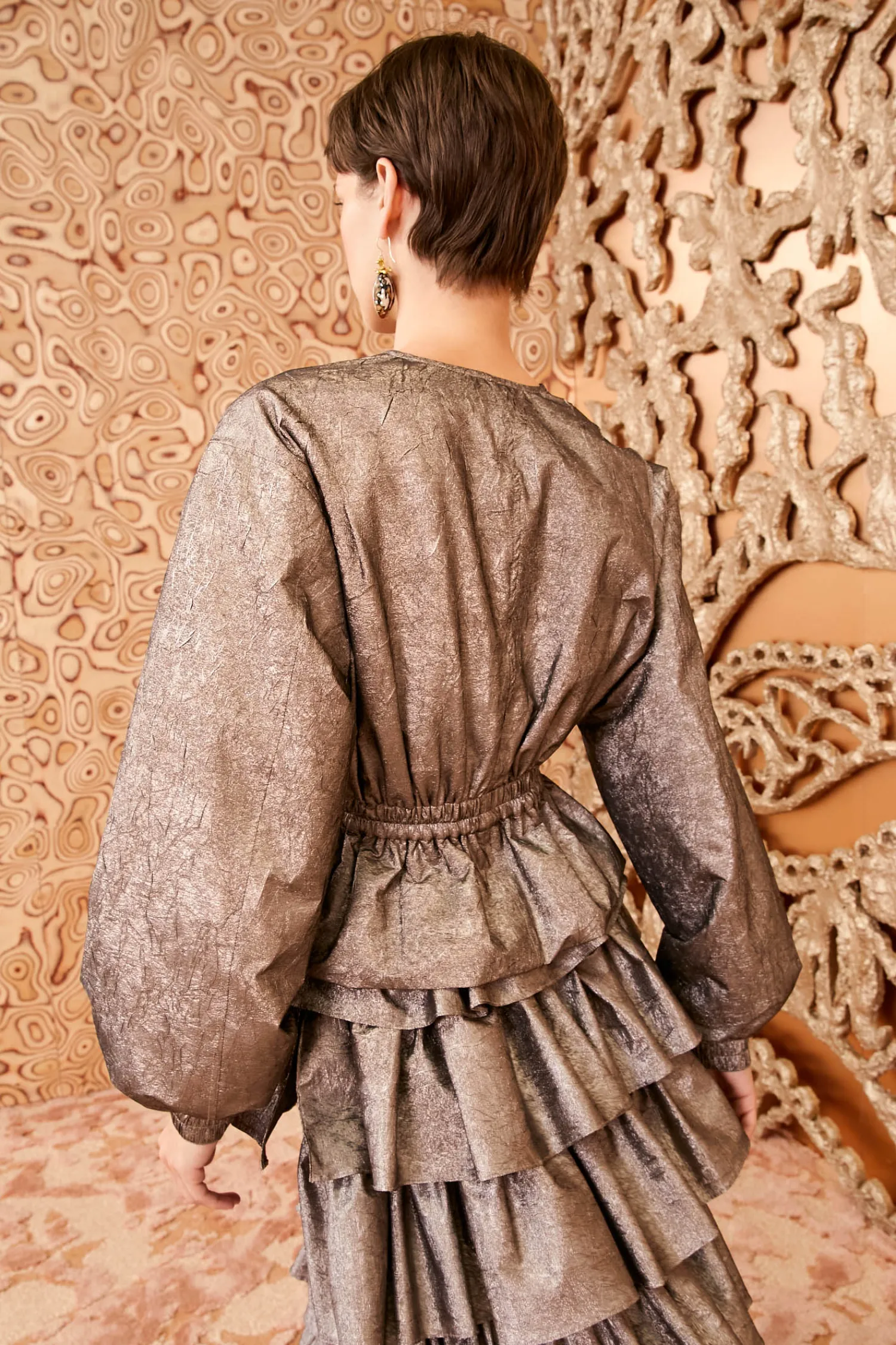 Featured in Look 17 of the Autumn/Winter ‘24 runway show, the Thalia Jacket is a stunning beauty made from our luxurious crushed metallic taffeta, a featherlight fabrication that retains its sculptural shape. It arrives in glittering graphite gray, has a gorgeous ruffled peplum, and fastens with a zipper at the front.