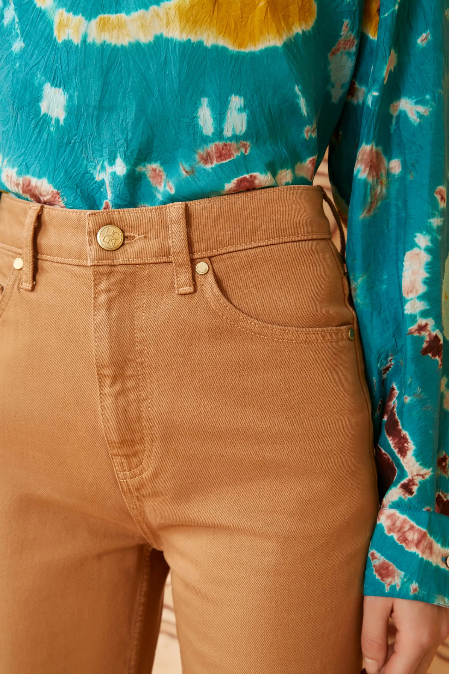 The newest lovely to join our denim lineup, the Martine reinterprets our beloved Lou silhouette with a more relaxed fit and a classic single-button fly. It is handcrafted in Los Angeles from our seasonal khaki-hued denim using sustainable practices, has a high waist, and is adorned with our signature brass belt loop and logo-embossed leather patch.
